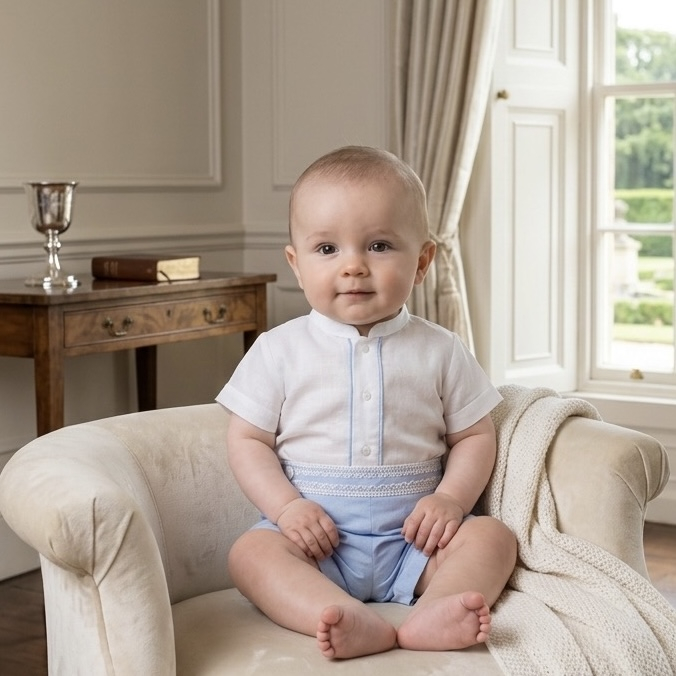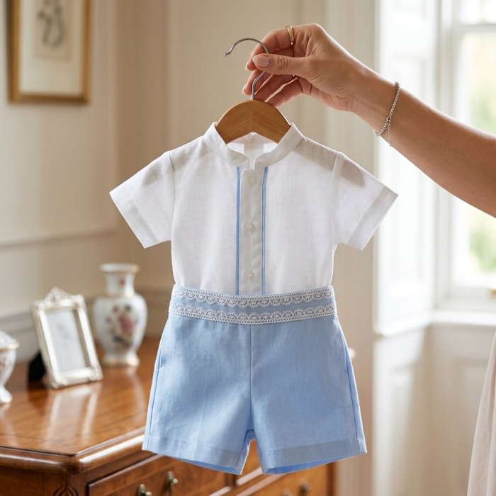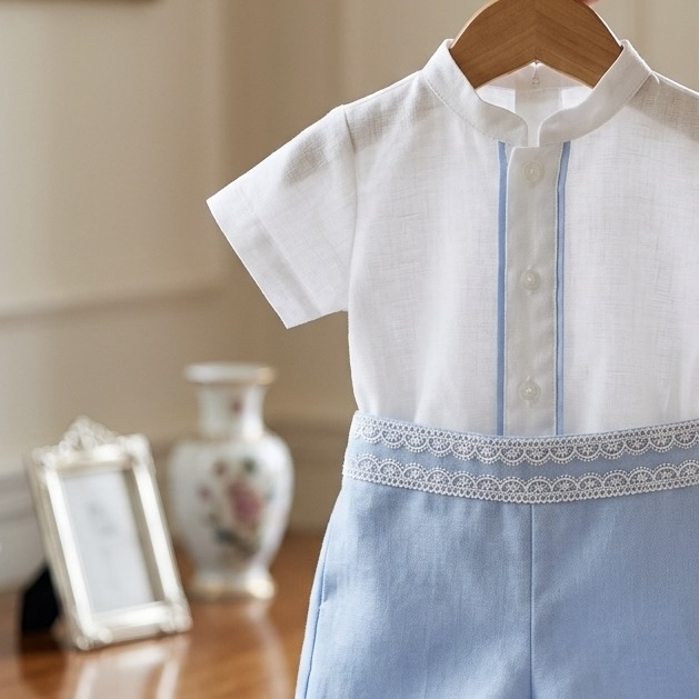Acest costumaș de botez este compus dintr-o cămașă ivoire cu guler mandarin  și pantaloni scurți . Cămașa este decorată cu o bandă delicată ,iar pantalonii in partea de sus a taliei sunt decorati cu danteluta fina . Este o ținută elegantă și potrivită pentru ocazii speciale.