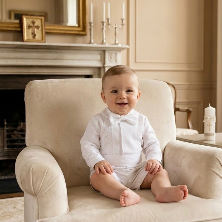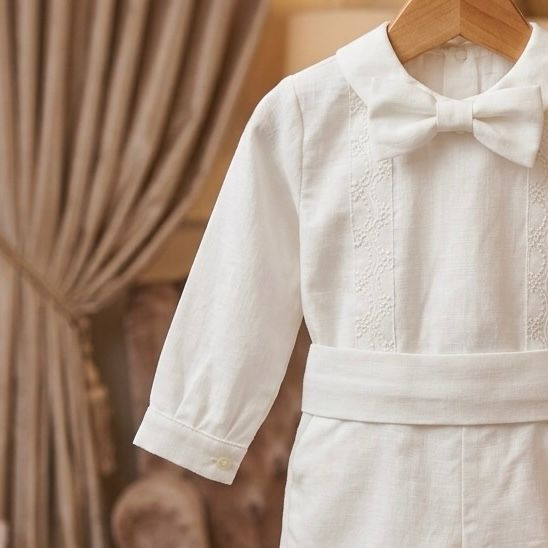 Acest costumaș de botez este confecționat dintr-un material de culoare ivoire , cu o cămașă cu mâneci lungi și un guler rotund. Are un detaliu din dantelă pe partea din față a cămășii un papion ivoire  si un brau de culoare ivoire . Pantalonii scurți sunt asortați cu cămașa. Este o ținută elegantă și potrivită pentru un eveniment special.