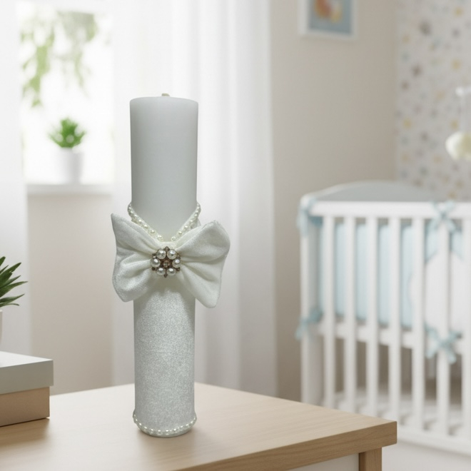 Această lumânare de botez emană eleganță și feminitate, fiind îmbrăcată în partea inferioară cu o catifea fină de culoare ivoire. Punctul central de atracție este o fundă amplă, realizată din același material prețios, decorată în mijloc cu o broșă strălucitoare din perle și cristale.