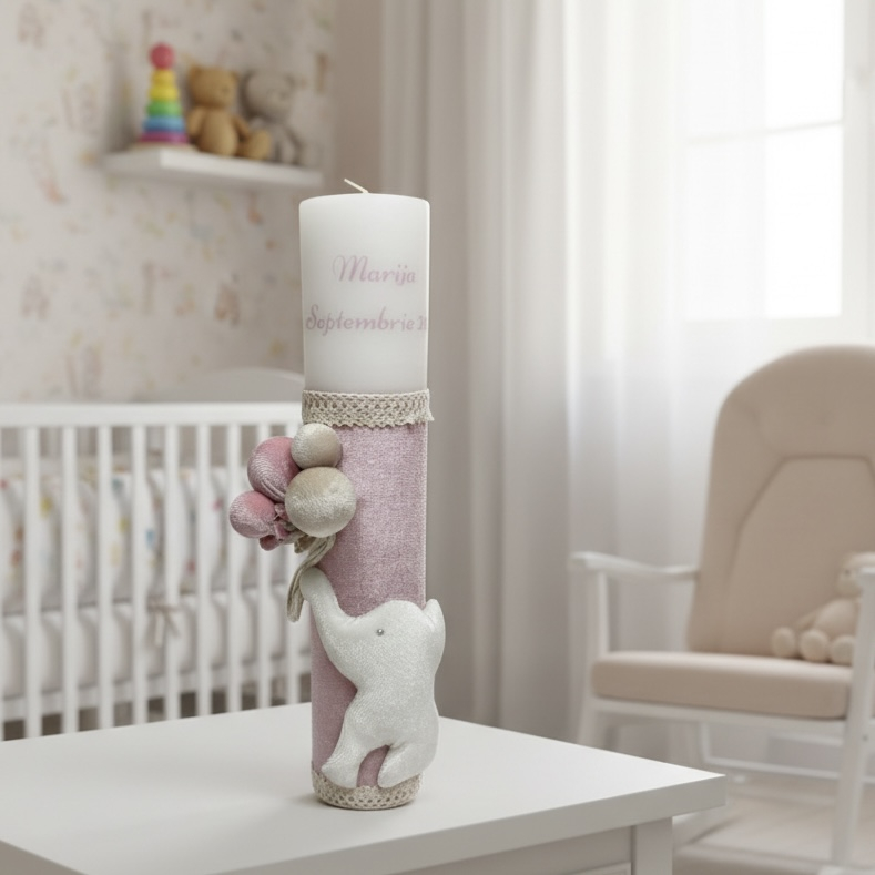 Această lumânare de botez este îmbrăcată în partea inferioară cu o catifea fină de culoare roz prafuit,oferind un aspect nobil și sofisticat. Designul este completat de o dantelă bej delicată la margini și un elefant simpatic din catifea care ține un buchet de baloane asortate în nuanțe de roz prafuit si bej.