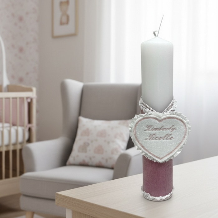 Lumanare botez decorata cu accesorii de calitate. Lumanarea se poate personaliza la cererea clientului contracost