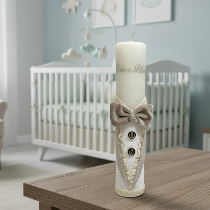 Această lumânare de botez se distinge printr-un design sofisticat de tip "Micul Cavaler", fiind îmbrăcată în partea inferioară cu o catifea fină de culoare ivoire. Aspectul festiv este completat de un papion amplu din catifea bej-auriu, revere stilizate cu volănașe și nasturi decorativi, imitând o ținută de gală.