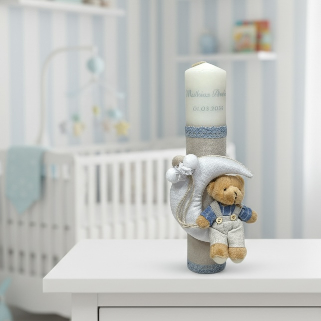 Lumanare botez decorata cu accesorii de calitate. Lumanarea se poate personaliza la cererea clientului contracost.