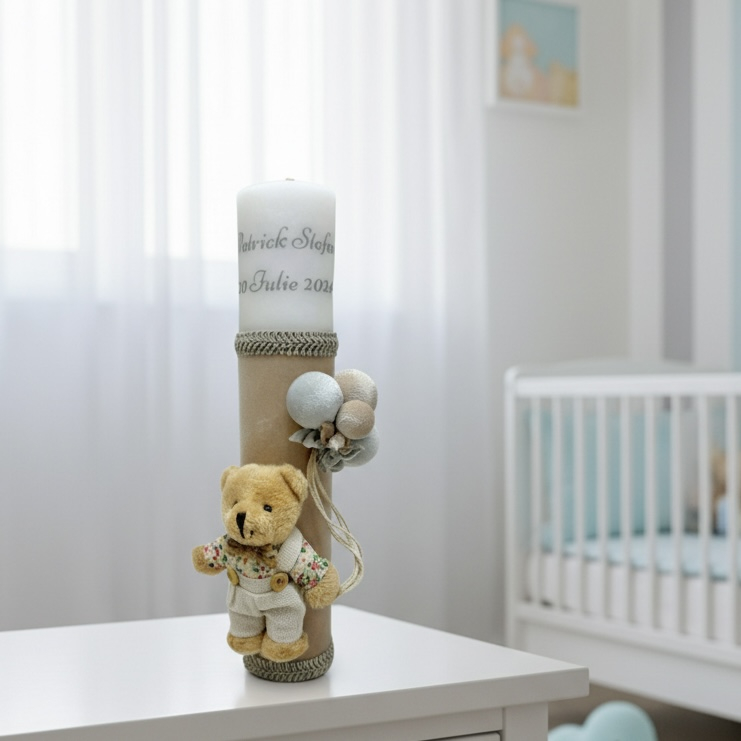 Această lumânare de botez elegantă este îmbrăcată în partea inferioară cu o catifea fină de culoare bej, oferind o textură prețioasă și plăcută la atingere. Designul este completat de benzi decorative împletite și un ursuleț de pluș adorabil, care ține un buchet de baloane textile în nuanțe asortate.