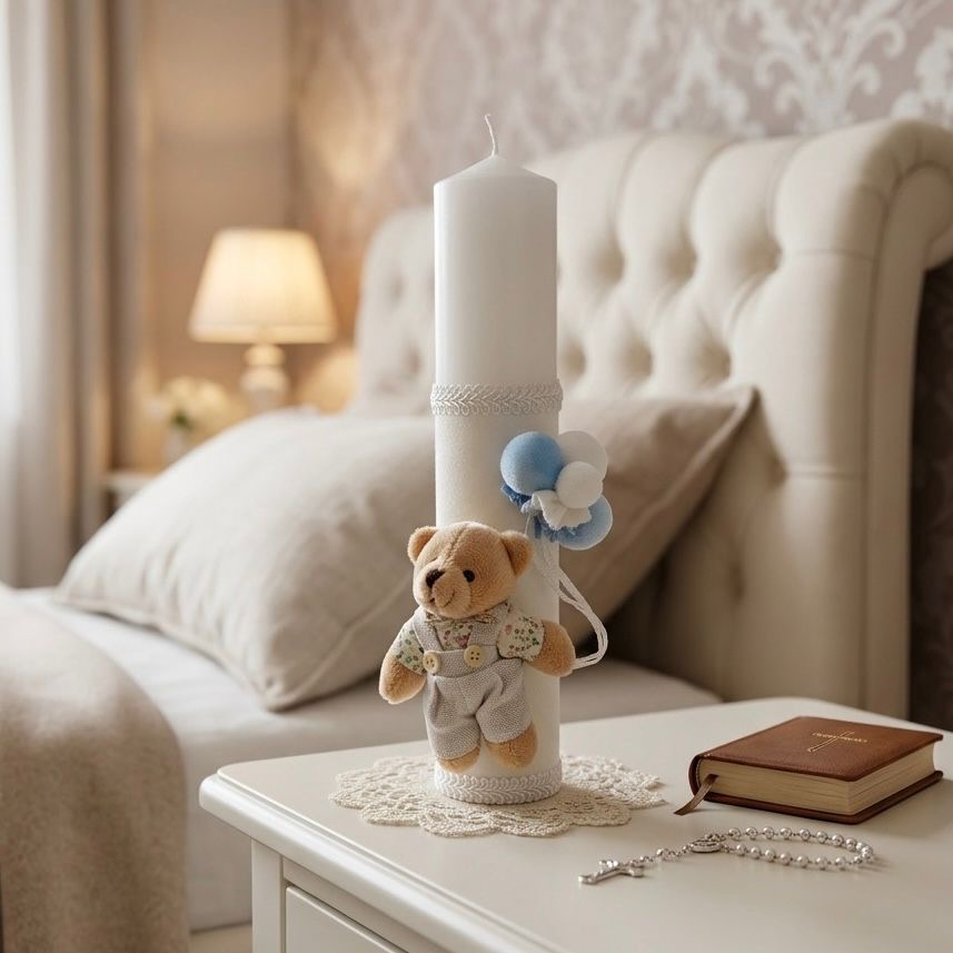Această lumânare de botez elegantă este îmbrăcată în partea inferioară cu o catifea fină de culoare ivoire, oferind o textură prețioasă și plăcută la atingere. Designul este completat de benzi decorative împletite și un ursuleț de pluș adorabil, care ține un buchet de baloane textile în nuanțe asortate.