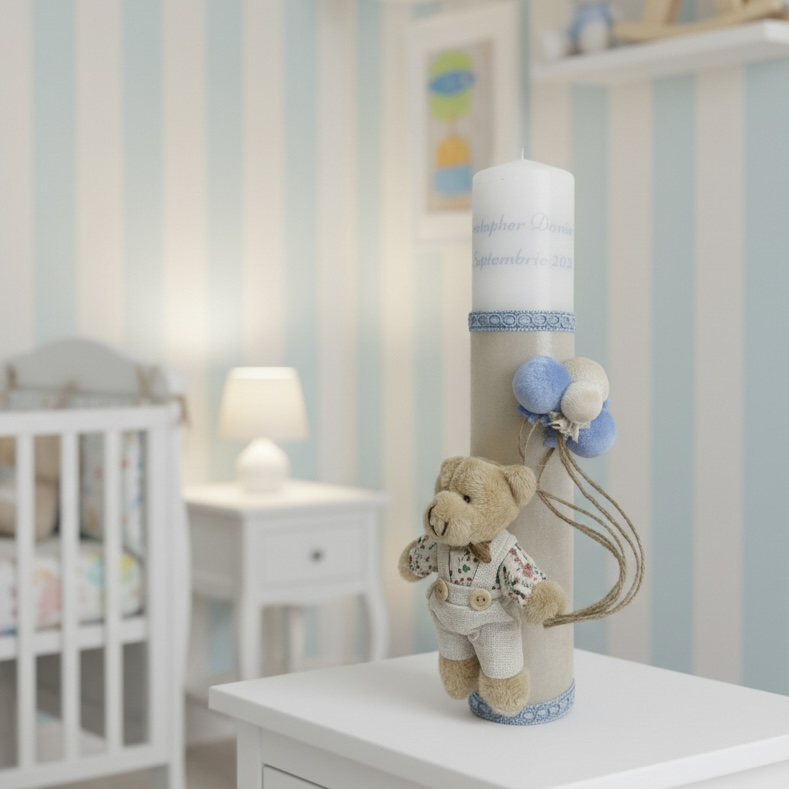 Această lumânare de botez elegantă este îmbrăcată în partea inferioară cu o catifea fină de culoare bej, oferind o textură prețioasă și plăcută la atingere. Designul este completat de benzi decorative împletite și un ursuleț de pluș adorabil, care ține un buchet de baloane textile în nuanțe asortate.