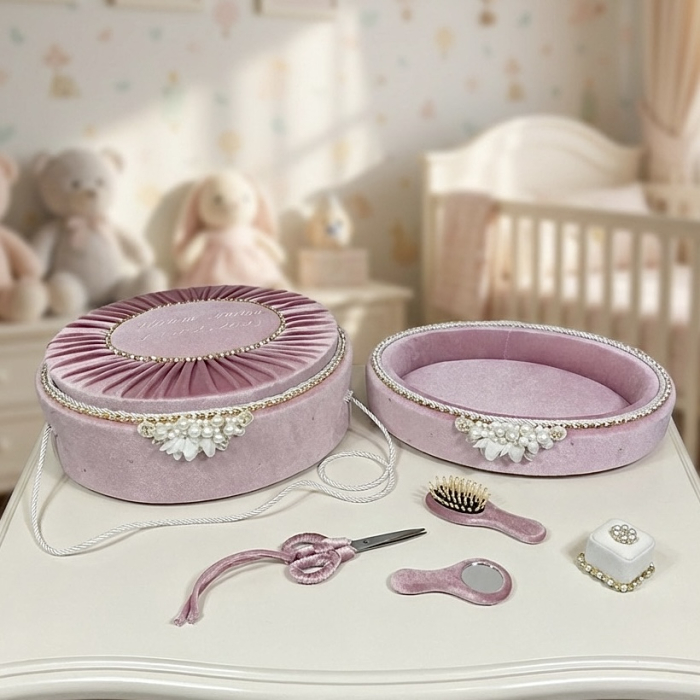 Setul este completat de accesoriile necesare ceremoniei (perie, oglindă, foarfecă și cutiuță pentru șuviță), toate perfect asortate cromatic. Este alegerea ideală pentru o ceremonie regală, plină de stil și delicatețe.