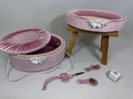 Acest set premium pentru tăierea moțului este o expresie a rafinamentului, fiind realizat din catifea fină într-o nuanță superbă de roz prăfuit. Setul este compus din două piese centrale, decorate cu mare atenție la detalii: