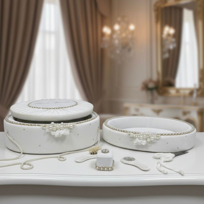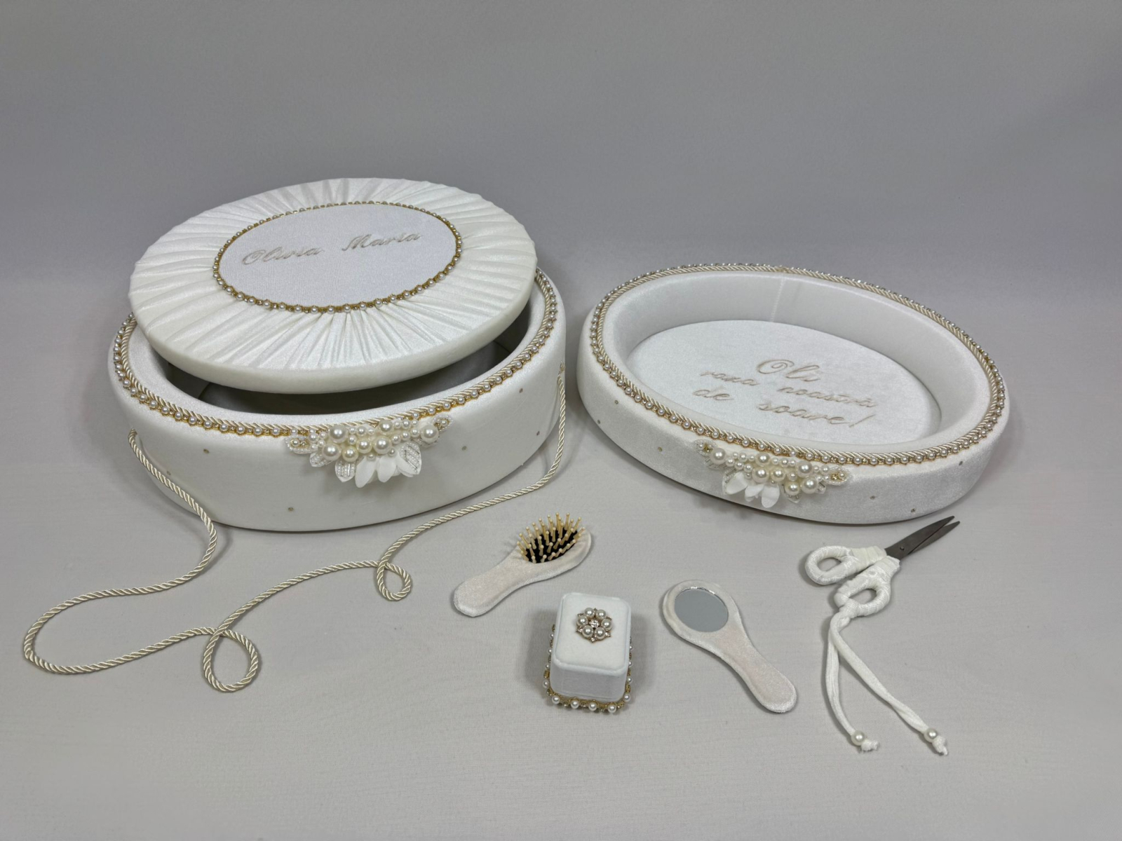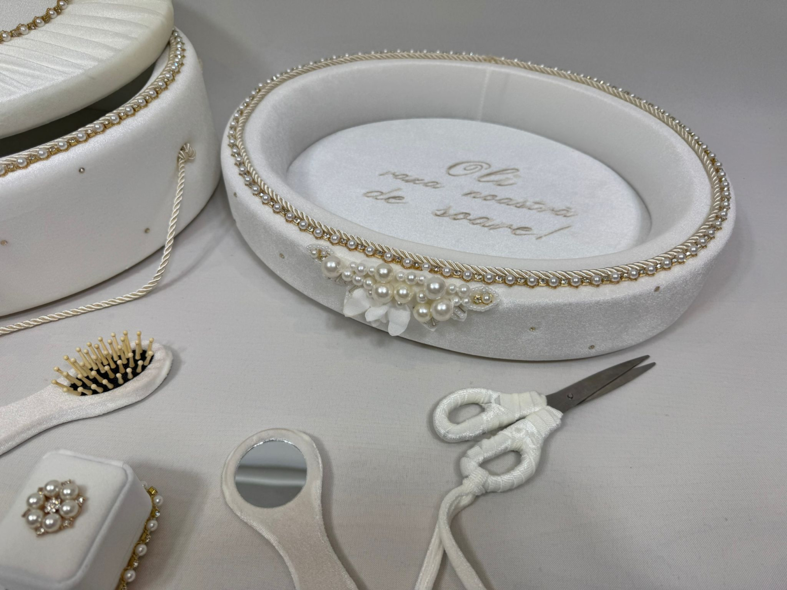 Setul este completat de accesoriile necesare ceremoniei (perie, oglindă, foarfecă și cutiuță pentru șuviță), toate perfect asortate cromatic. Este alegerea ideală pentru o ceremonie regală, plină de stil