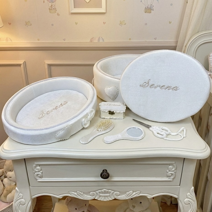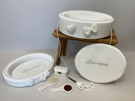1. O tăviță ovală, decorată cu un șnur împletit argintiu, o fundiță delicată și o inimioară aplicată, având numele copilului ("Serena") brodat elegant în centru.