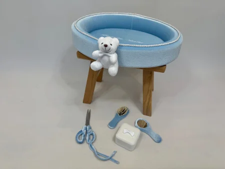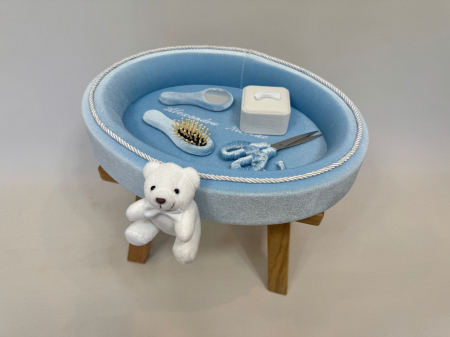 Această tăviță elegantă pentru tăierea moțului este realizată din catifea fină într-o nuanță senină de albastru deschis (bleu). Designul oval este conturat de un șnur decorativ împletit, iar elementul central de atracție este un mic ursuleț de pluș alb, atașat pe marginea tăviței, care adaugă o notă adorabilă și jucăușă.