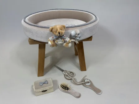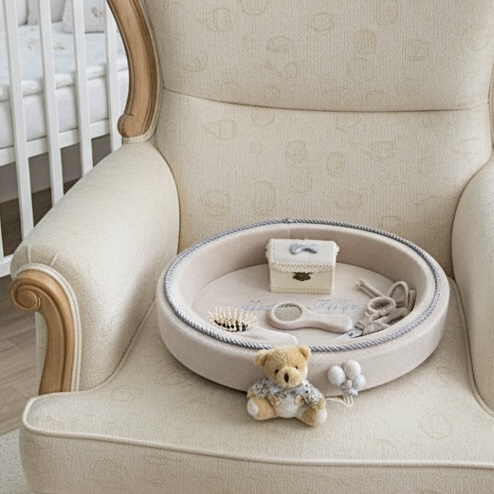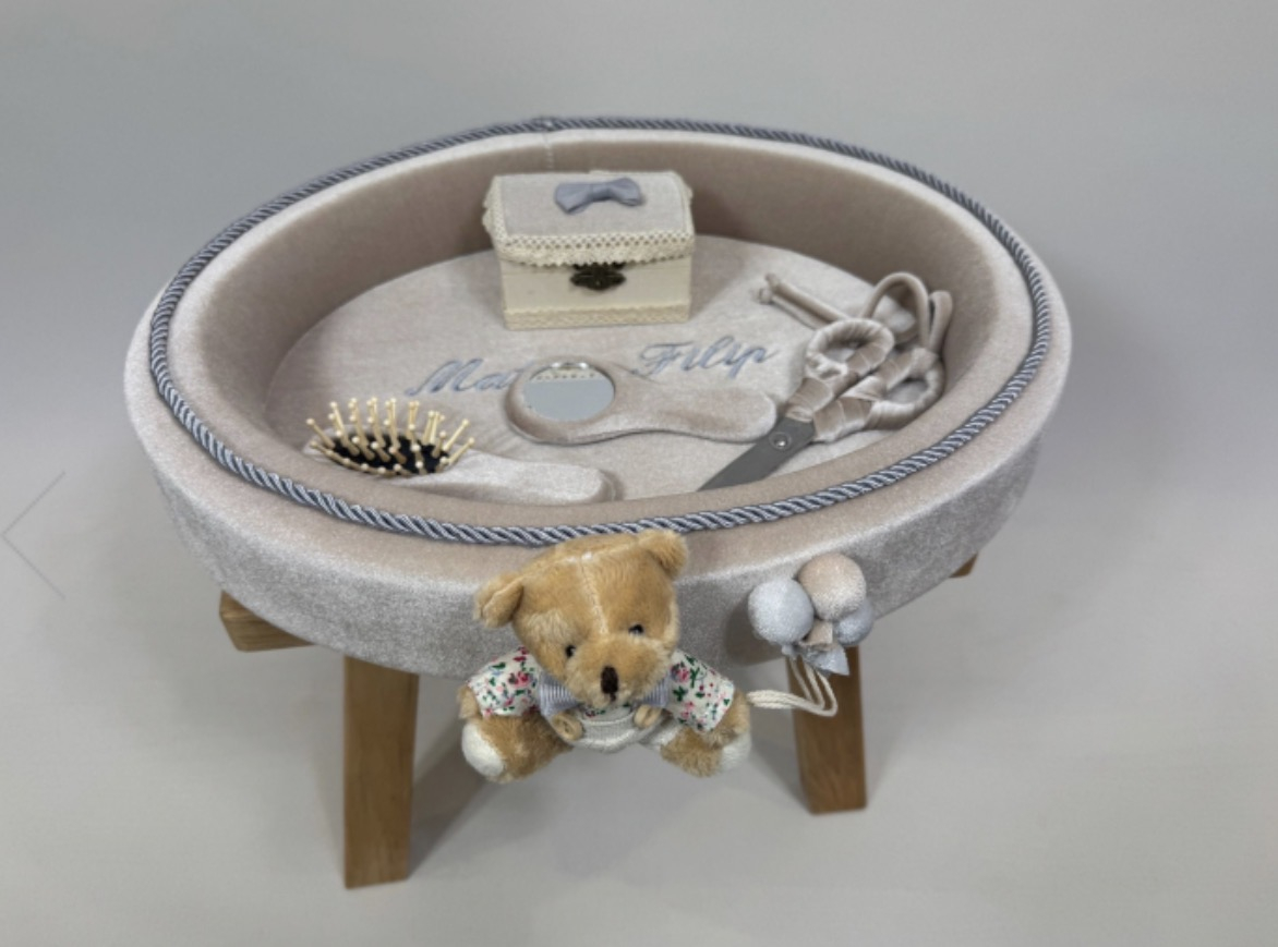 Această tăviță elegantă pentru tăierea moțului este realizată din catifea fină într-o nuanță caldă de bej-nisipiu. Designul oval este conturat de un șnur decorativ împletit în tonuri de gri-argintiu, iar elementul central este un ursuleț de pluș adorabil, îmbrăcat festiv, atașat pe marginea tăviței alături de câteva baloane decorative textile.