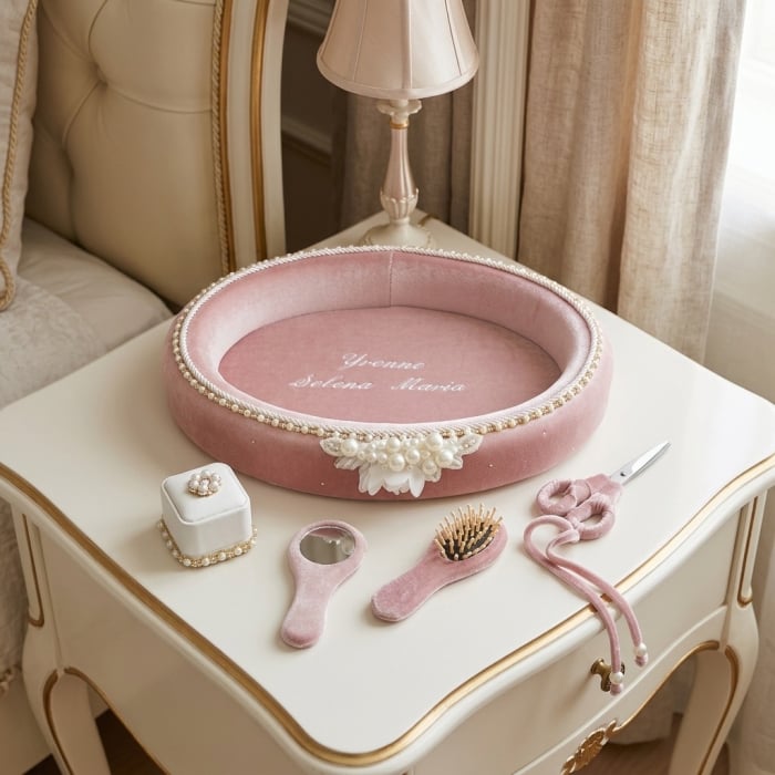 Această tăviță pentru tăierea moțului emană rafinament și delicatețe, fiind realizată din catifea fină într-o nuanță dulce de roz. Designul oval este înnobilat pe margine cu un șirag de perle, iar piesa de rezistență este un ornament bogat din perle și mărgele aplicat frontal, oferind un aspect regal.