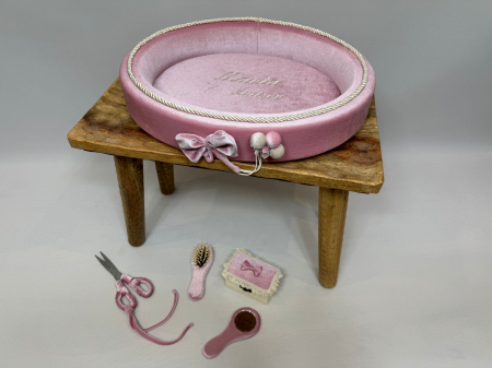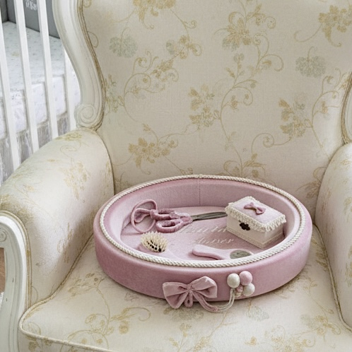 Această tăviță pentru tăierea moțului se remarcă prin puritate și rafinament, fiind realizată din catifea roz prafuit .Designul oval este accentuat de detalii în nuanțe de roz-bej,un șnur împletit pe margine, o fundă elegantă de catifea și un mic buchet de baloane textile decorative, care adaugă o notă jucăușă.
