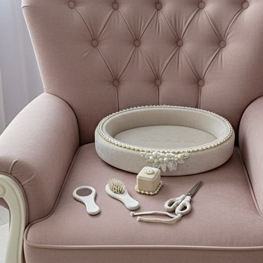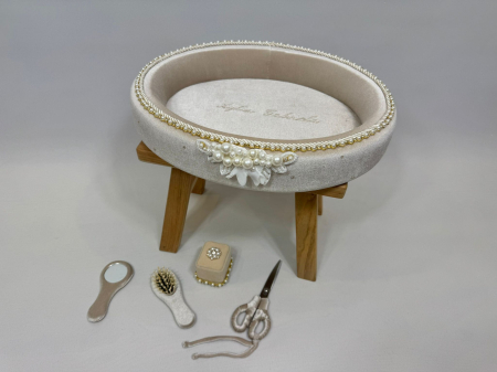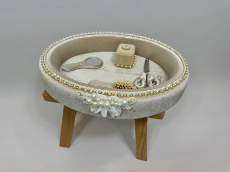 Această tăviță pentru tăierea moțului emană rafinament și delicatețe, fiind realizată din catifea fină într-o nuanță bej . Designul oval este înnobilat pe margine cu un șirag de perle, iar piesa de rezistență este un ornament bogat din perle și mărgele aplicat frontal, oferind un aspect regal.