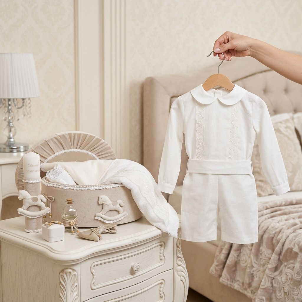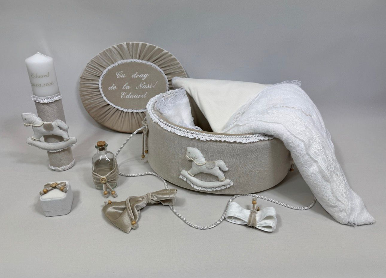Acest set de botez este compus din costumas elegant, lucrat manual, cu detalii delicate din dantelă și un trusou asortat in cufar din catifea,ce include o lumânare decorată. Fiecare piesă este realizată cu grijă, conferind un aer de rafinament și unicitate.