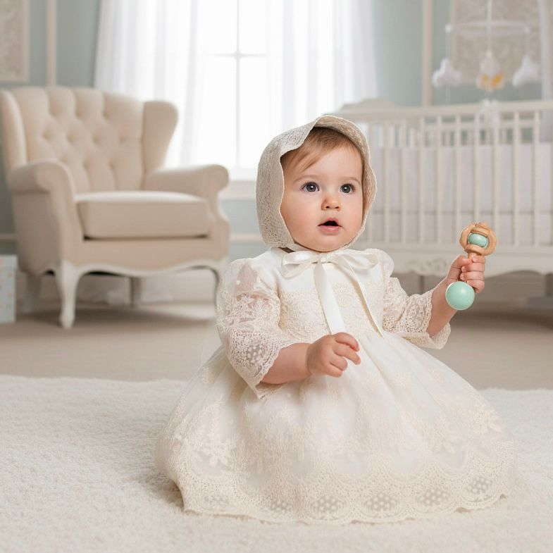 Acest set de botez este compus dintr-o rochiță elegantă, lucrată manual, cu detalii delicate din dantelă și un trusou asortat in cufar din catifea,ce include o lumânare decorată. Fiecare piesă este realizată cu grijă, conferind un aer de rafinament și unicitate.