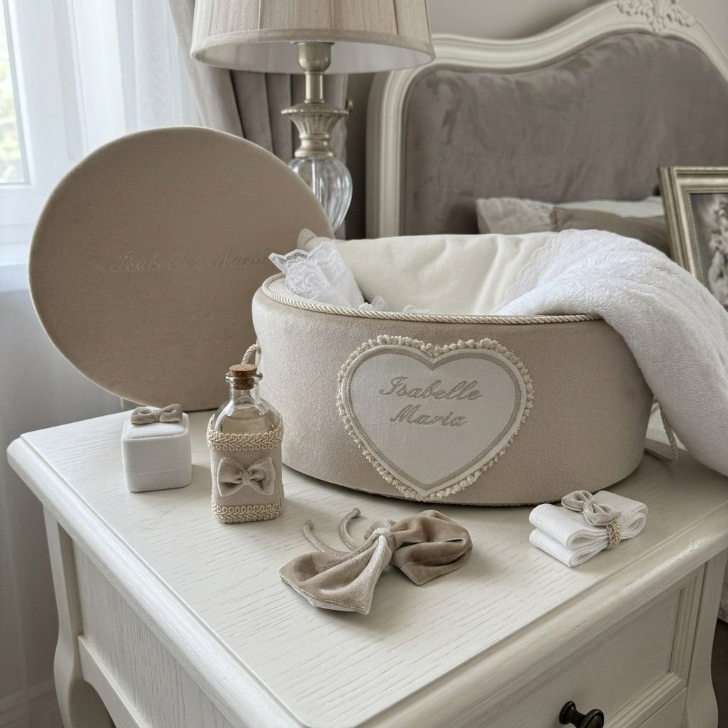 Eleganță desăvârșită pentru o zi de neuitat. Acest trusou de botez, creat cu grijă și pasiune, îmbină rafinamentul catifelei fine cu delicatețea detaliilor lucrate manual. Cufărul personalizat completează perfect o poveste. Un trusou memorabil, creat special pentru a păstra amintirile primei taine a creștinismului.