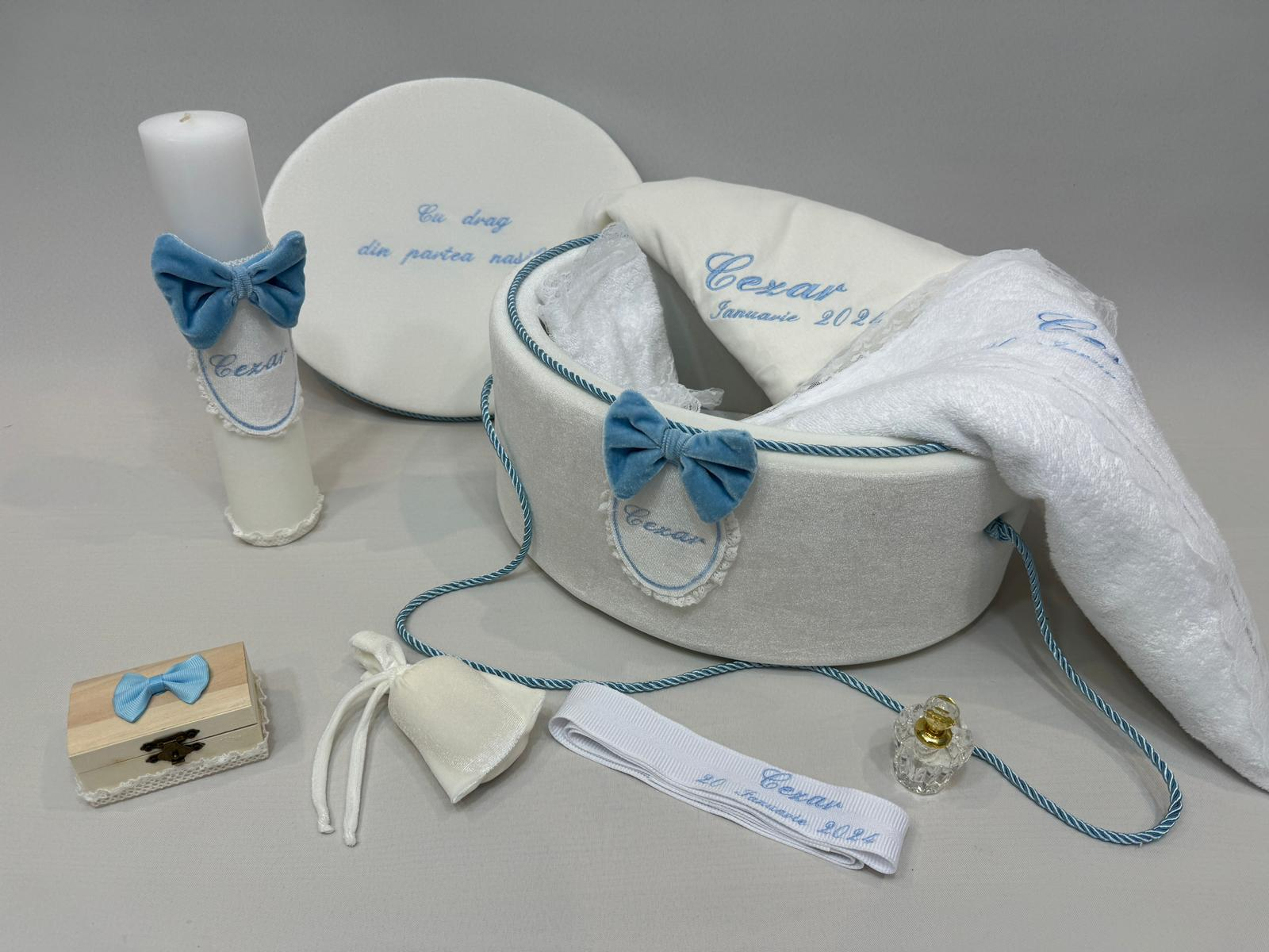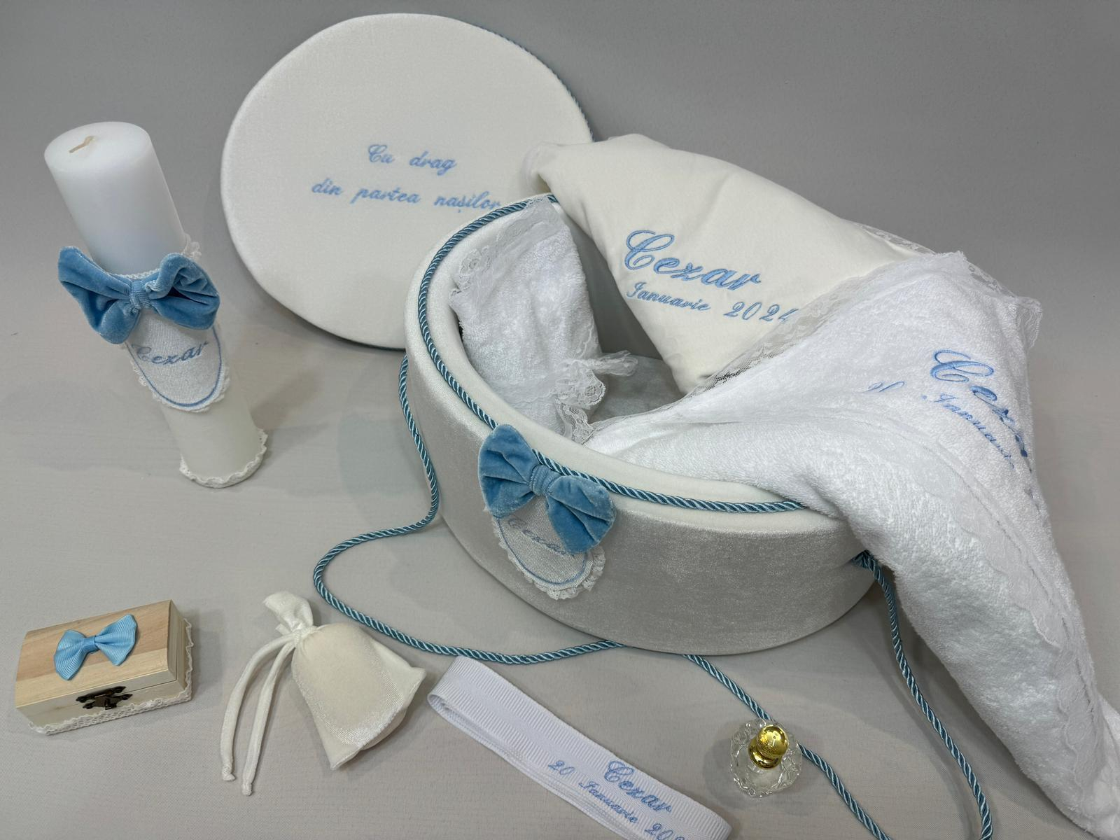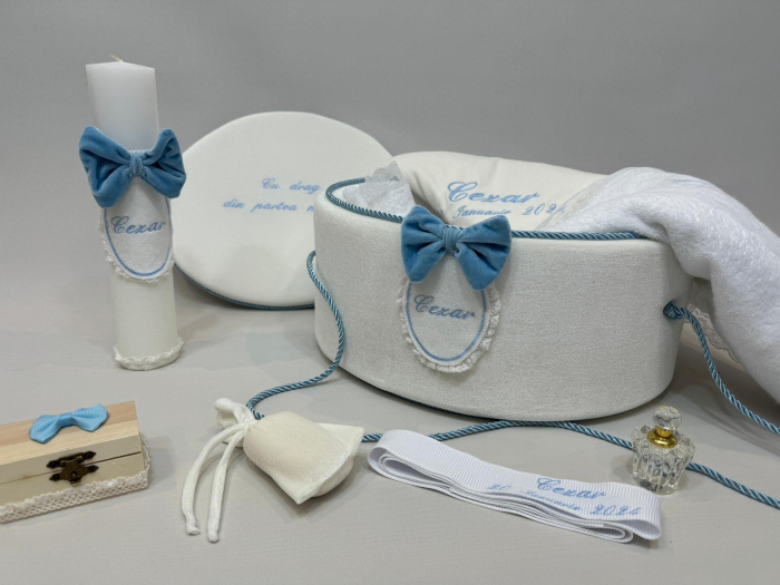 Eleganță desăvârșită pentru o zi de neuitat. Acest trusou de botez, creat cu grijă și pasiune, îmbină rafinamentul catifelei fine cu delicatețea detaliilor lucrate manual. Cufărul personalizat, alături de lumânarea asortată, completează perfect o poveste. Un set memorabil, creat special pentru a păstra amintirile primei taine a creștinismului.