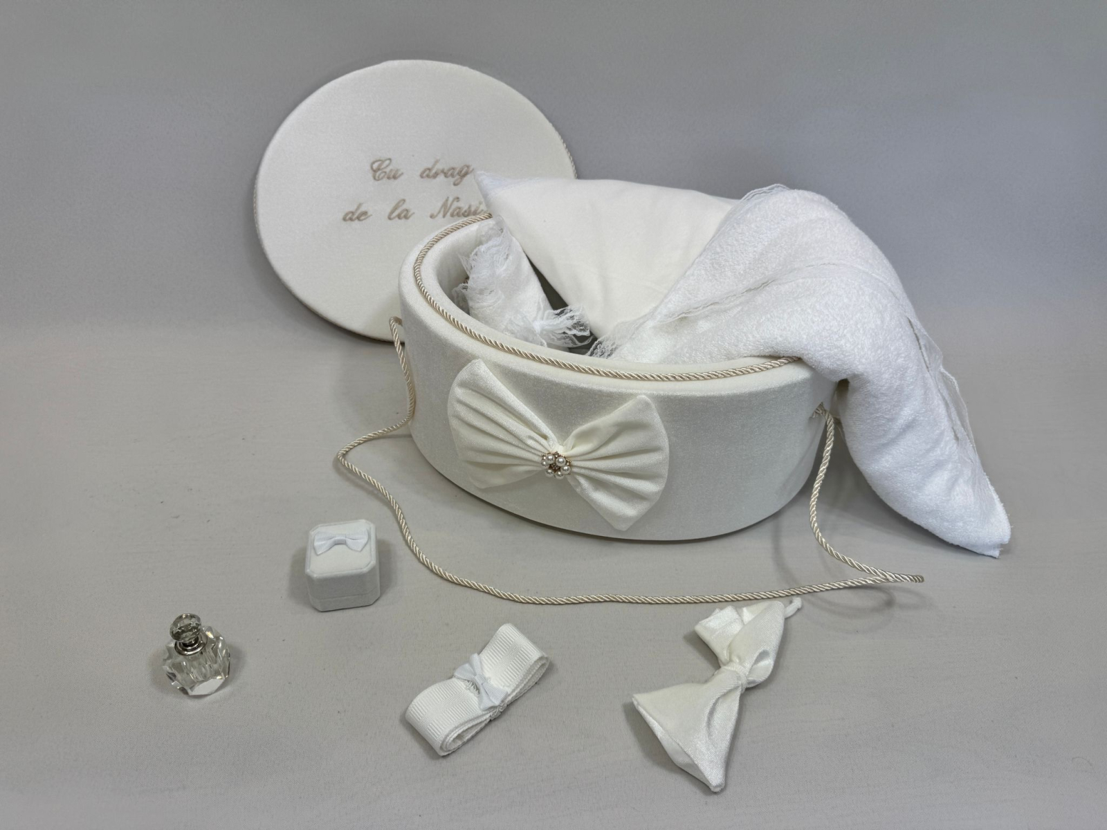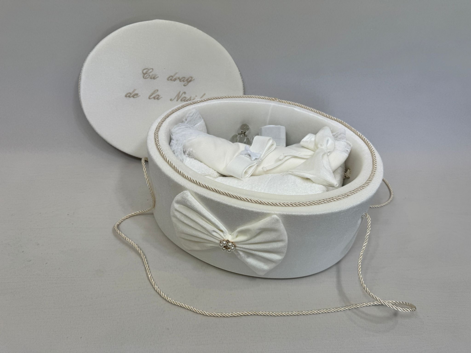 Trusou botez la cufar din catifea accesorizat cu dantelute si  accesorii de calitate.Trusoul se regaseste in cufar din catifea  .