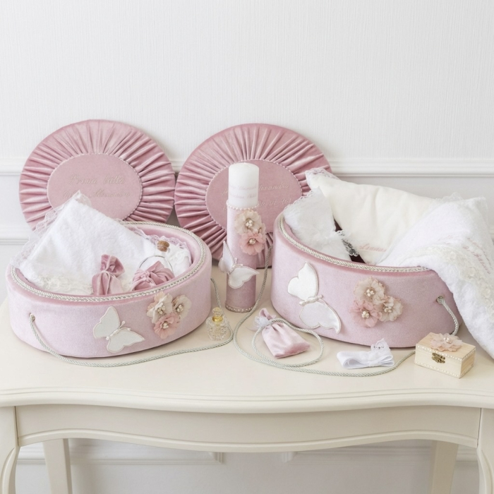 Acesta este un set complet și luxos pentru botez și „prima băiță”, realizat cu o atenție deosebită la detalii, într-o nuanță delicată de roz pudrat.