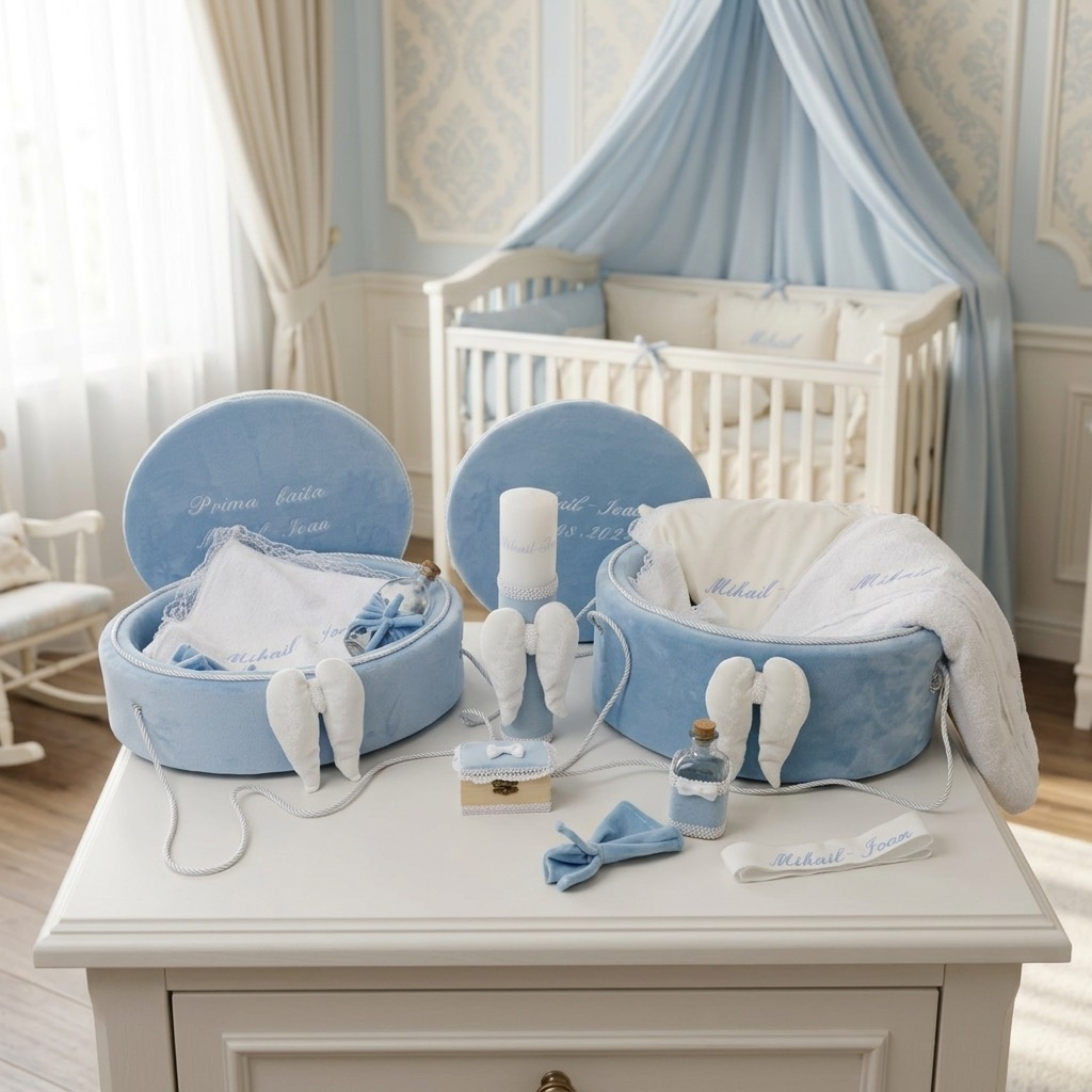 Acest set de trusou si prima baita, prezentate în cufere elegante din catifea blue lucrate manual, este o alegere rafinată pentru a celebra un moment special. Fiecare detaliu, contribuie la crearea unei amintiri prețioase. Setul include de asemenea, textile moi și totul aranjat cu grijă pentru a sublinia importanța evenimentului.