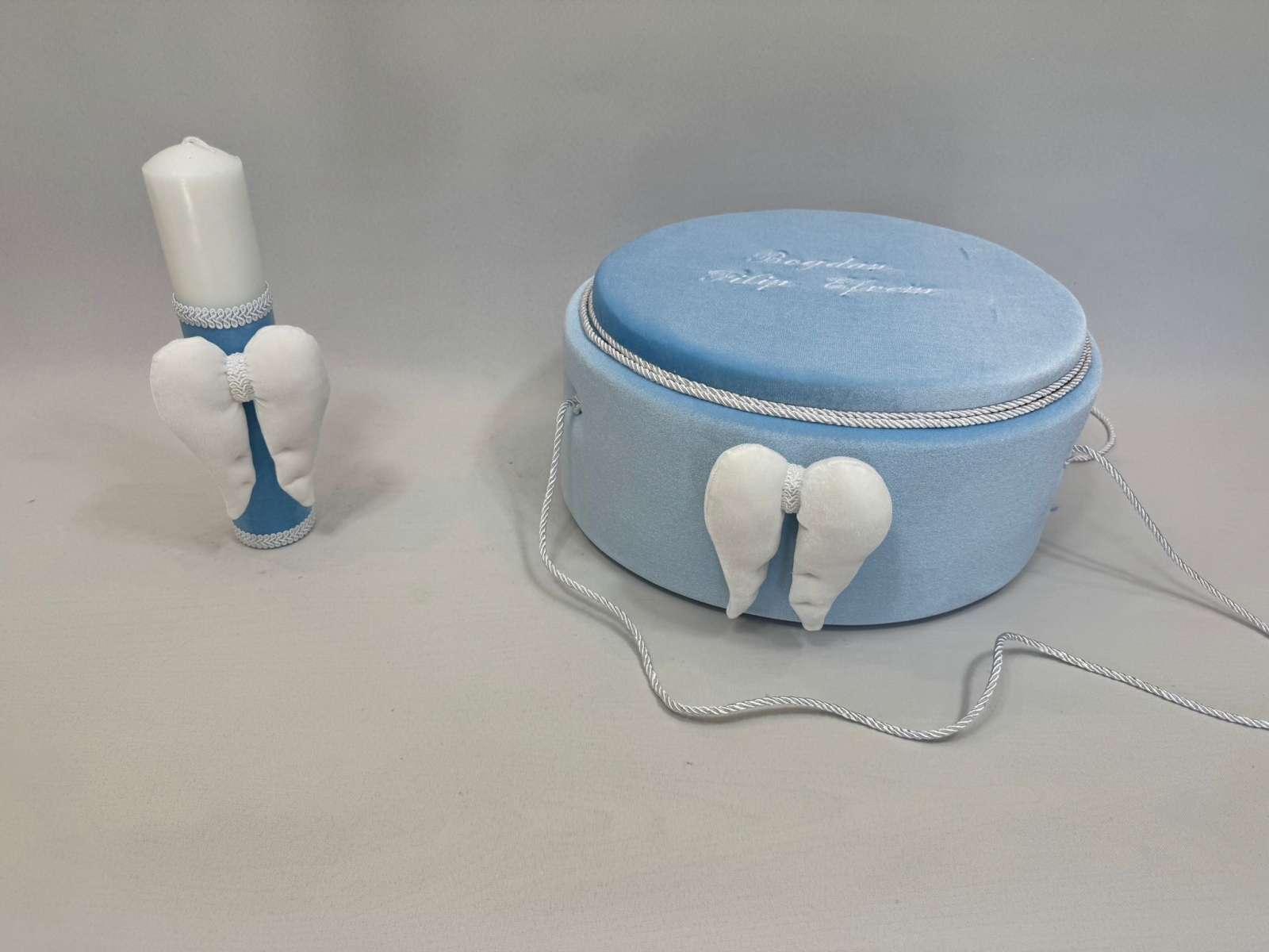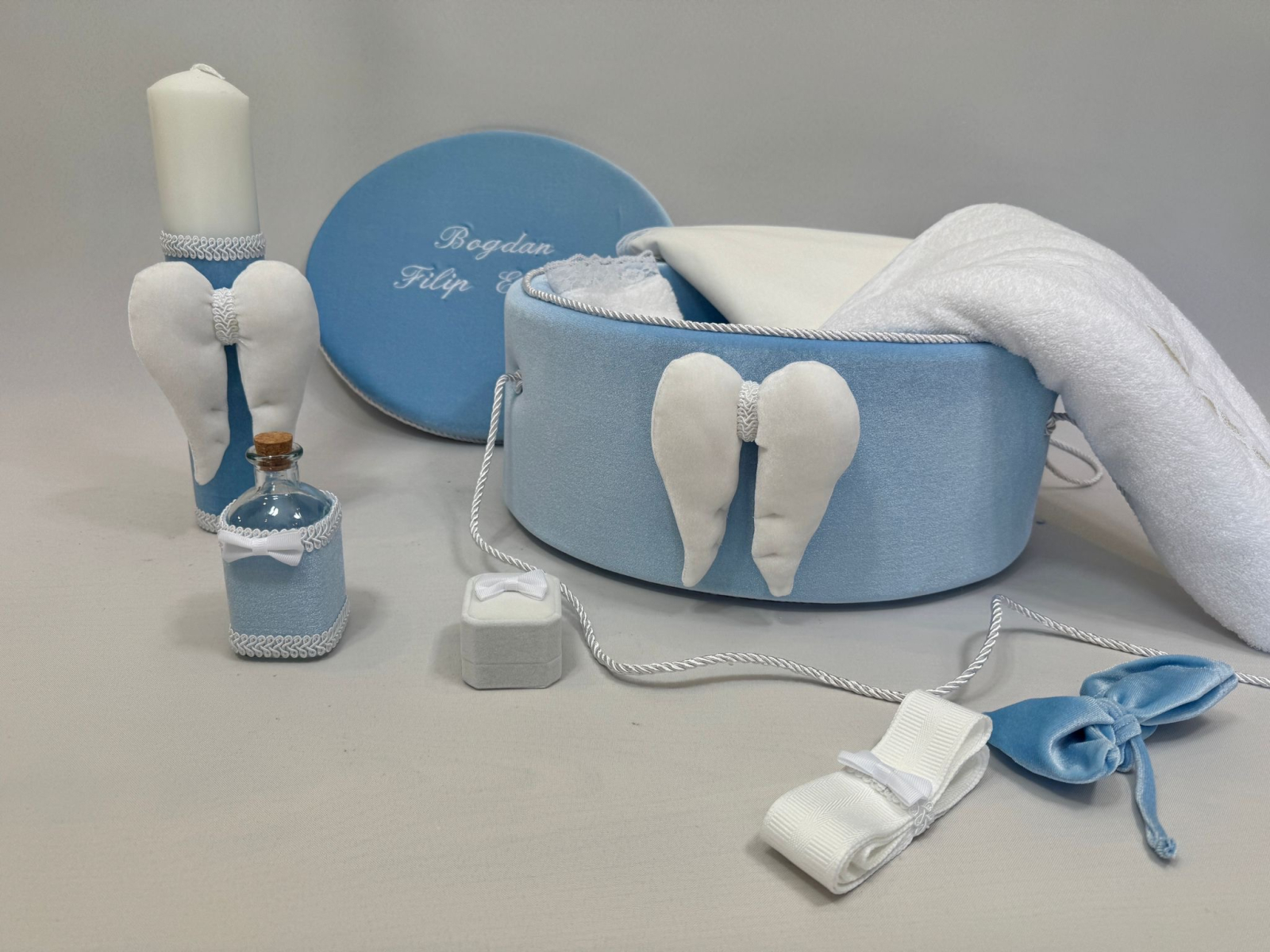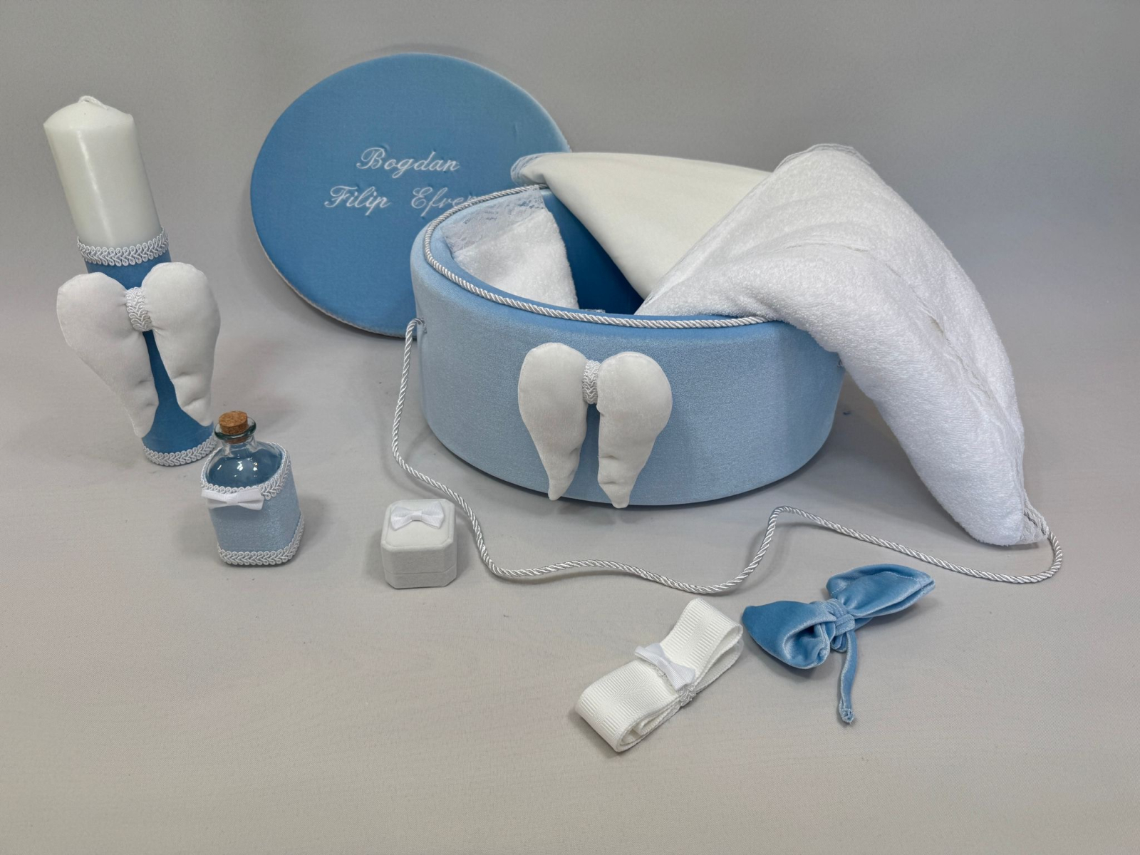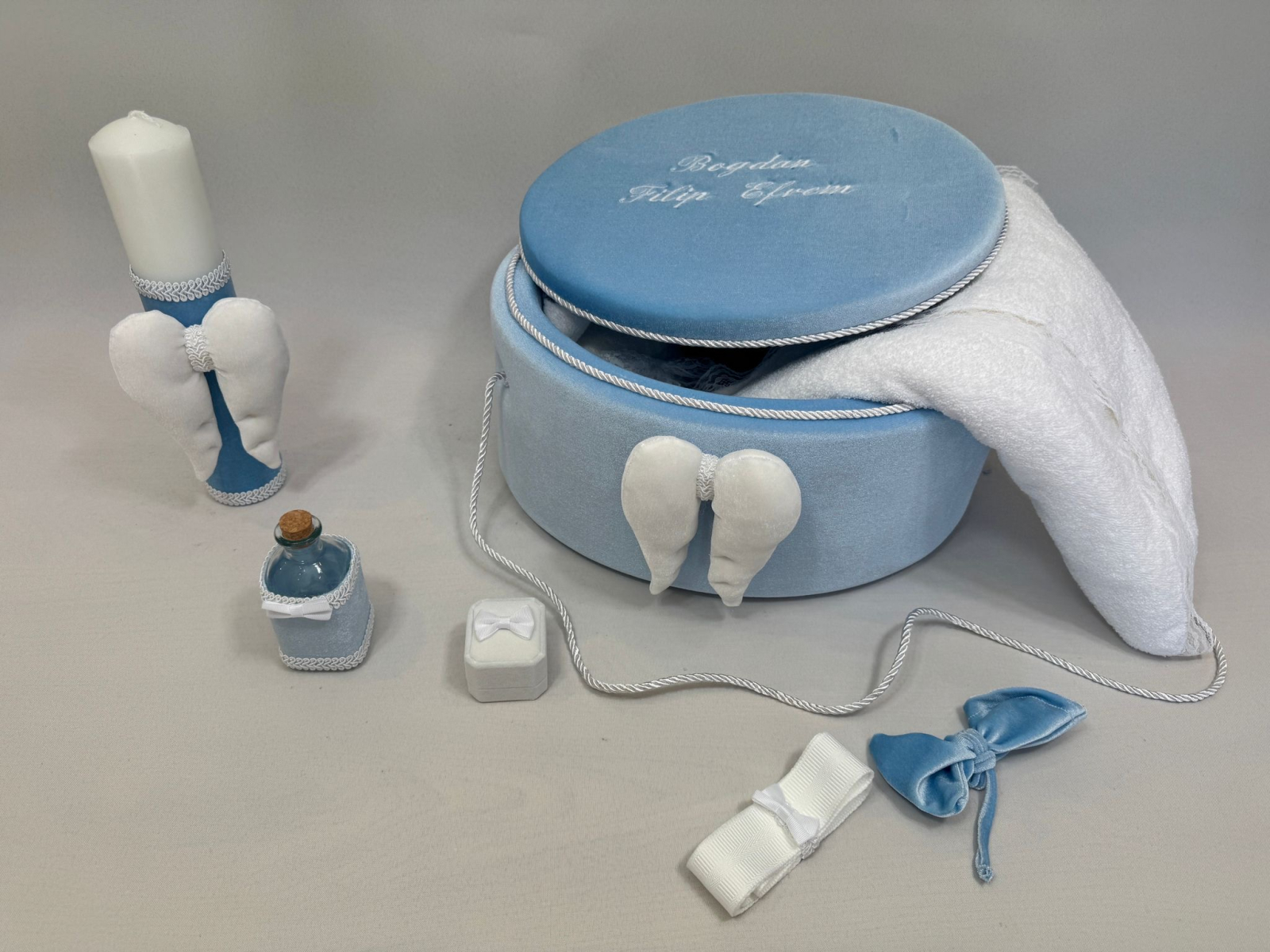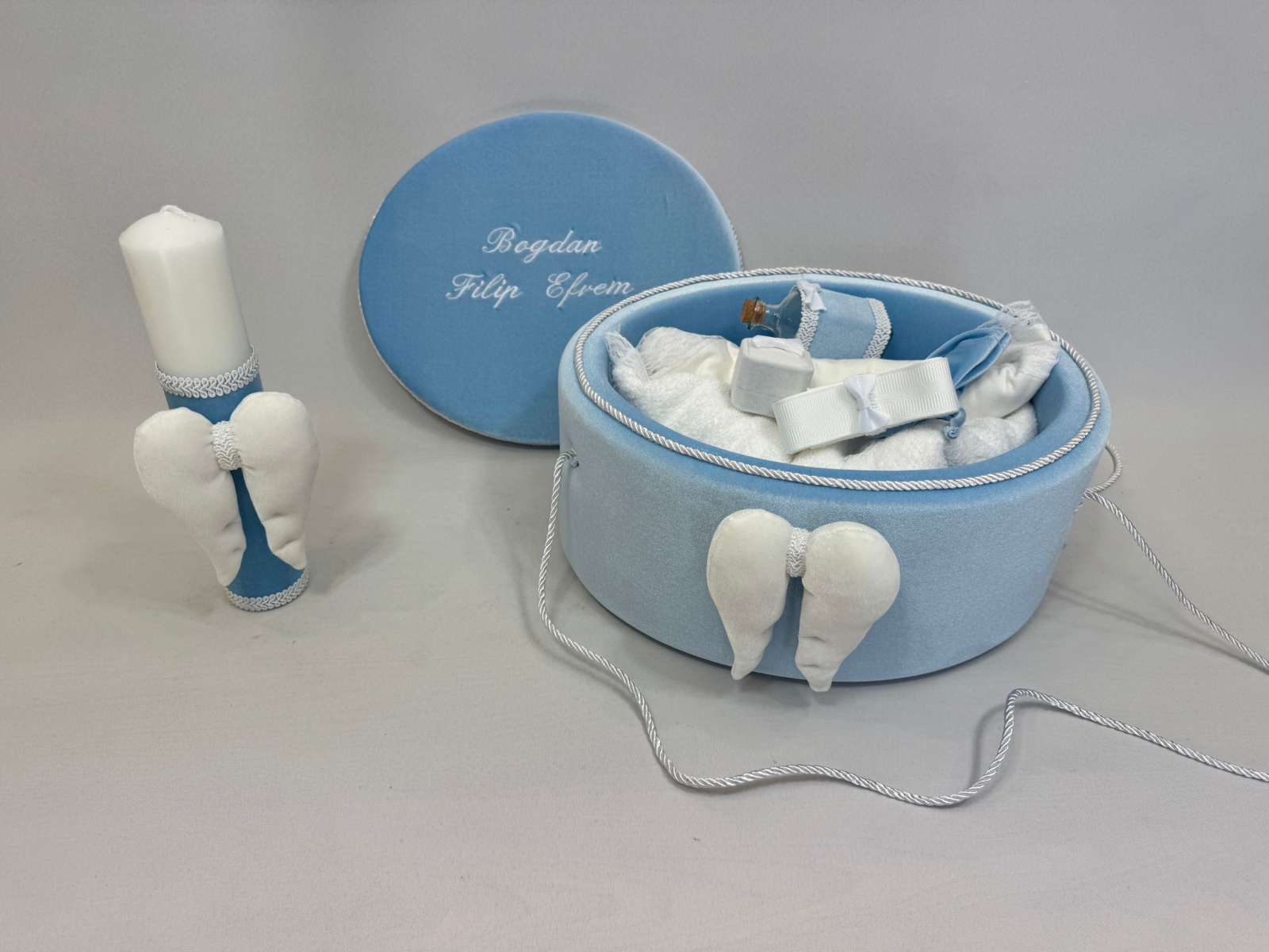 Trusou botez la cufar din catifea si lumanare accesorizate cu dantelute si  accesorii de calitate.Trusoul se regaseste in cufar din catifea de dimensiune standard cu capac si manere din snur iar dimensiunea cufaralui se poate achizitiona contracost si in varianta XL .Lumanarea este cilindrica si are dimensiunile 30/5.8 cm.