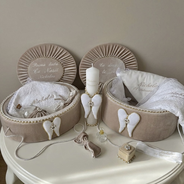 O creație manuală de excepție, acest set înnobilează tradiția prin catifea bej luxuriantă și simboluri angelice. Decorat cu aripi delicate și accente strălucitoare, trusoul este definiția eleganței supreme, fiind creat special pentru a păstra magia primelor amintiri într-un stil regal.