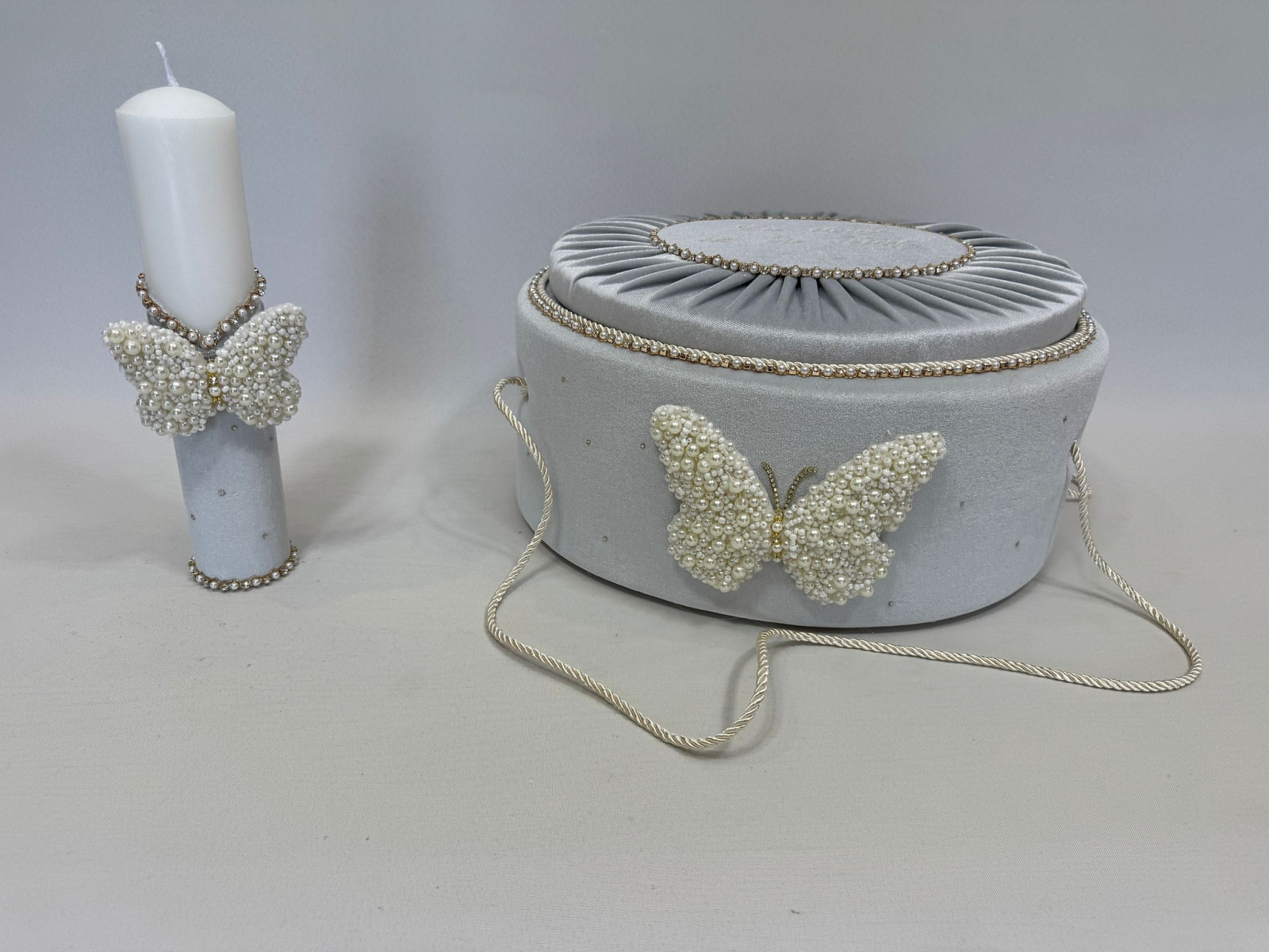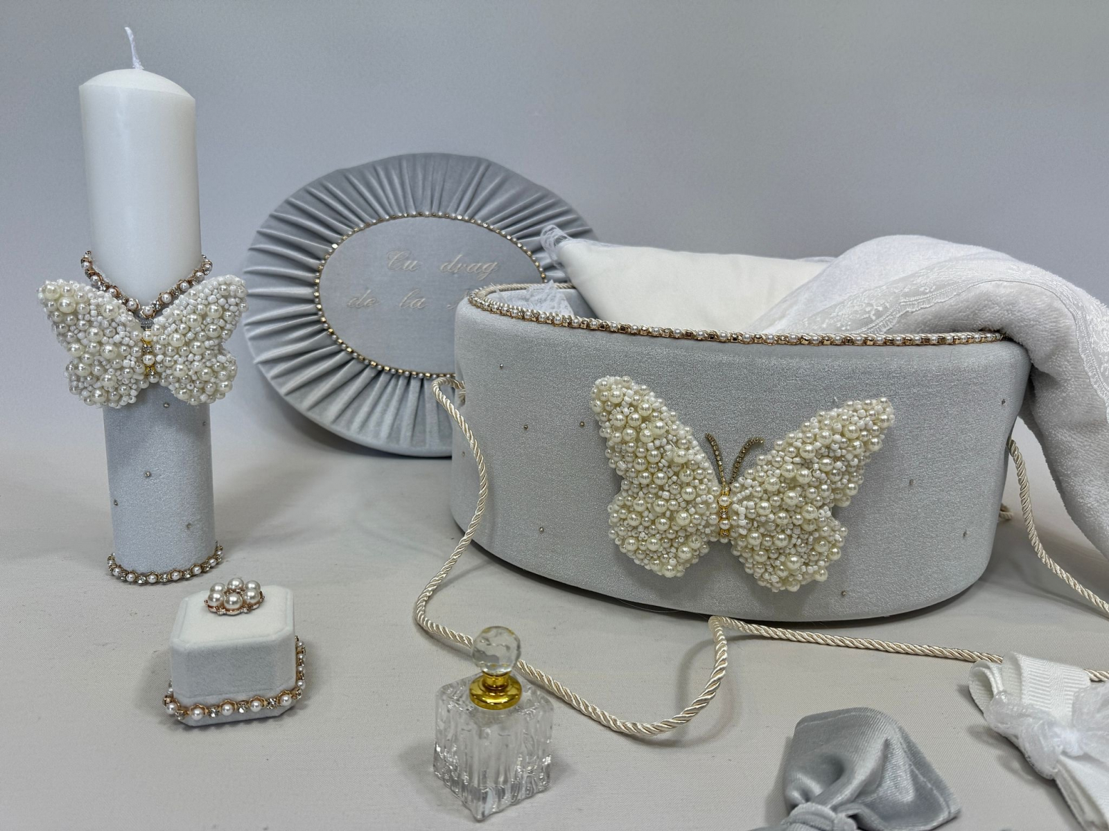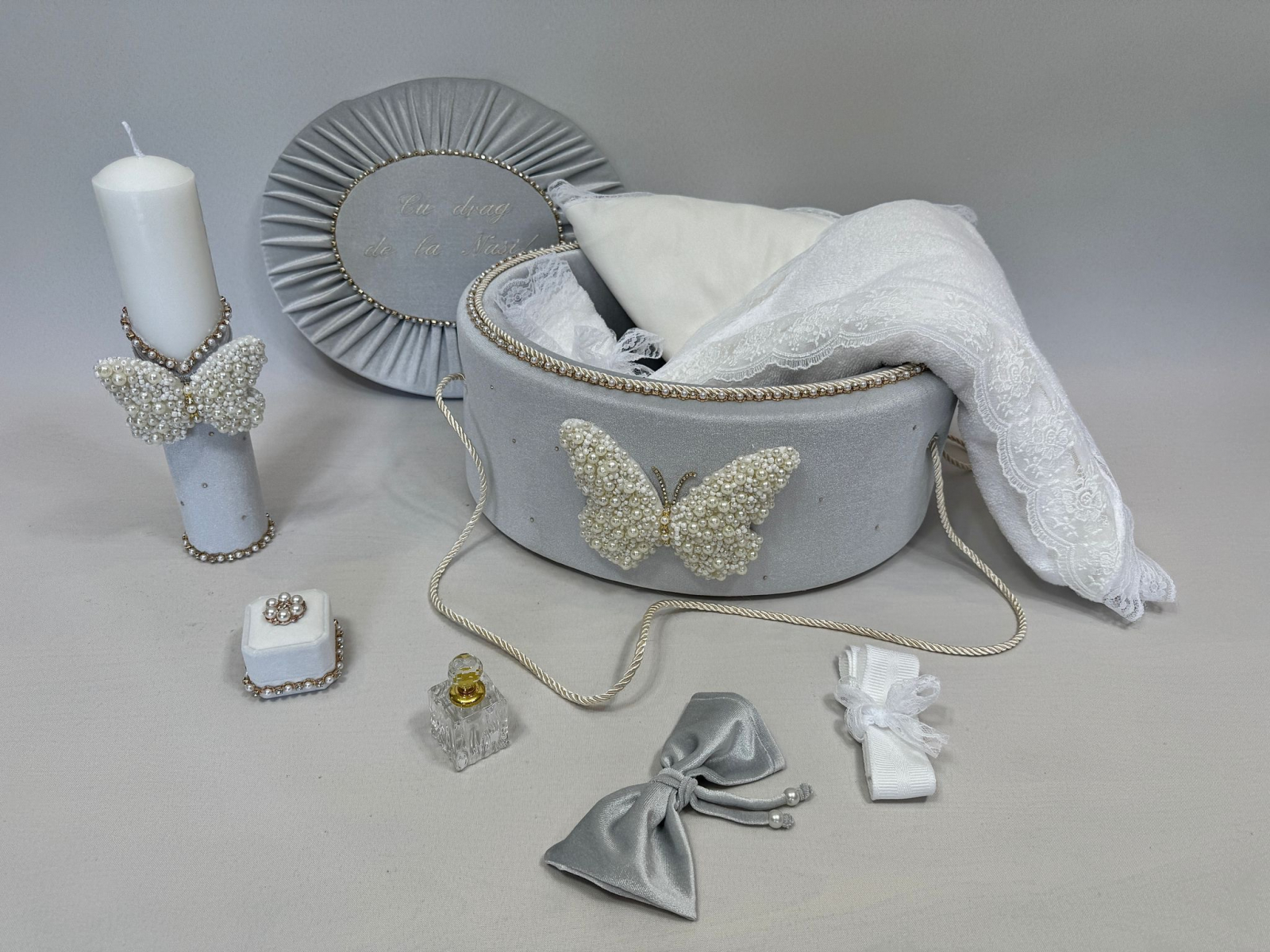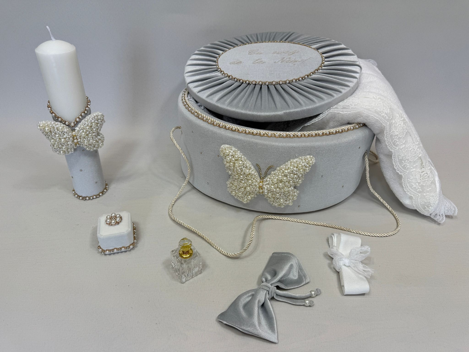 Trusou botez la cufar din catifea si lumanare accesorizate cu dantelute si  accesorii de calitate.Trusoul se regaseste in cufar din catifea  cu capac si manere din snur.Lumanarea este cilindrica si are dimensiunile 30/5.8 cm.