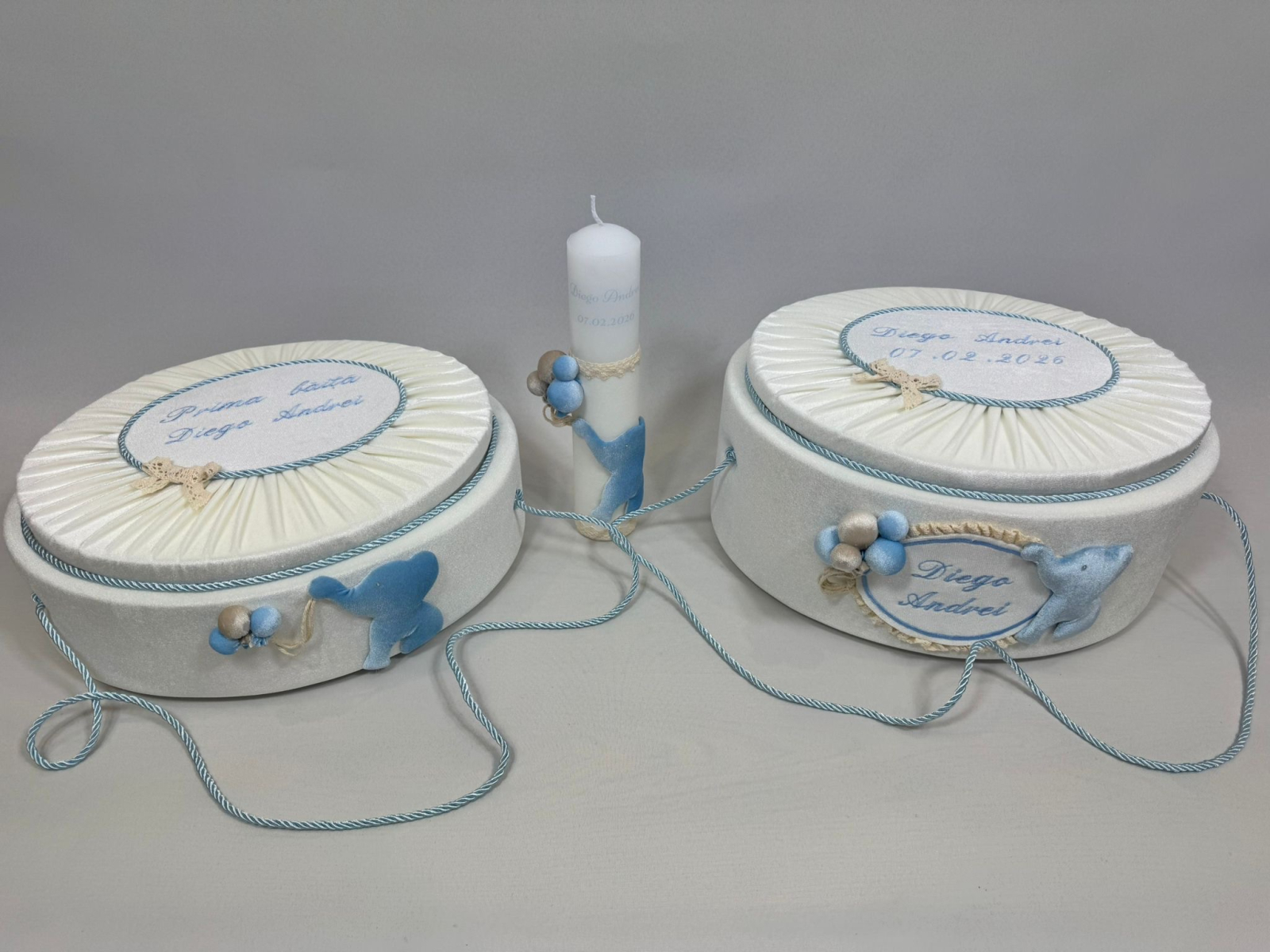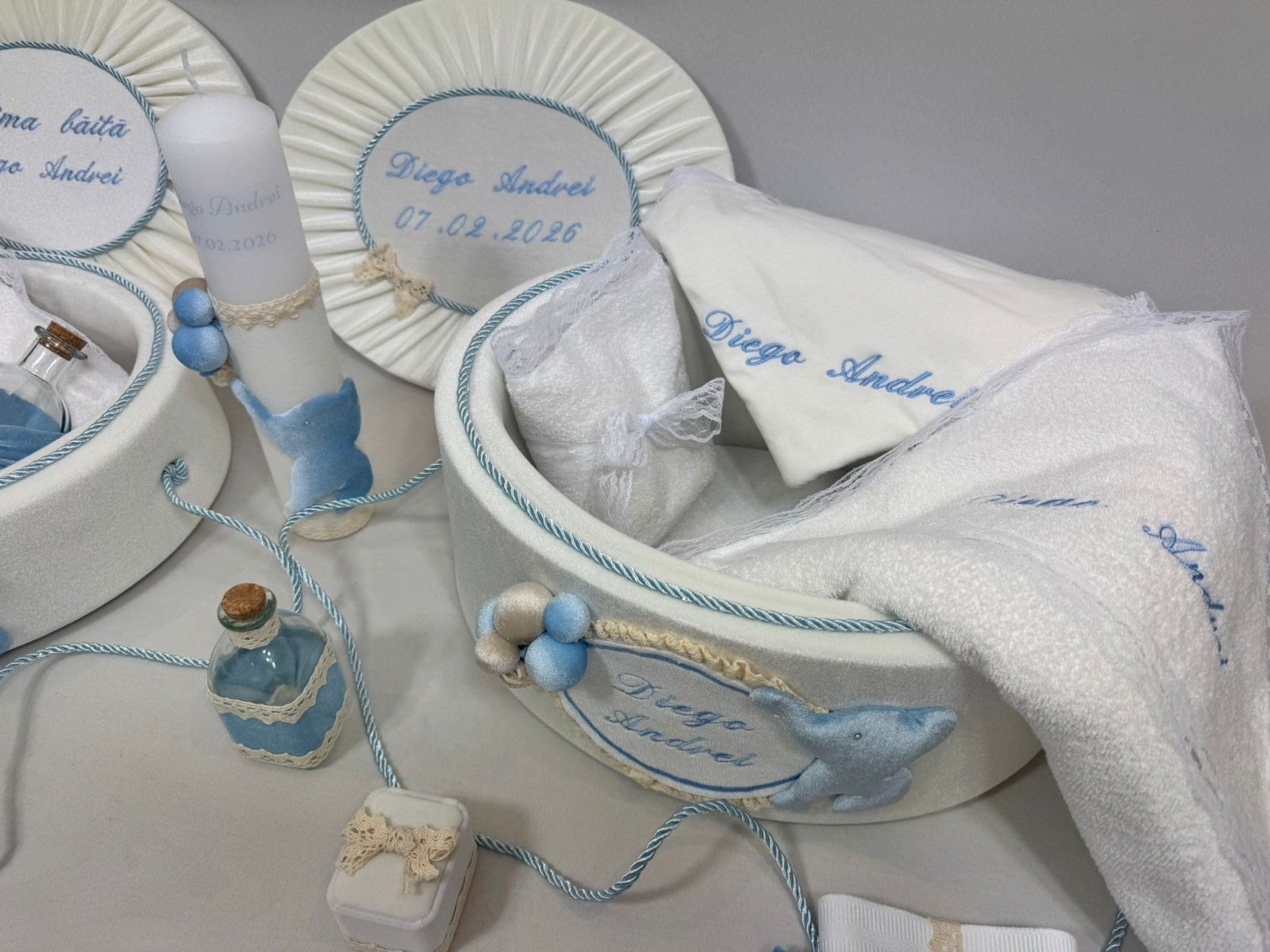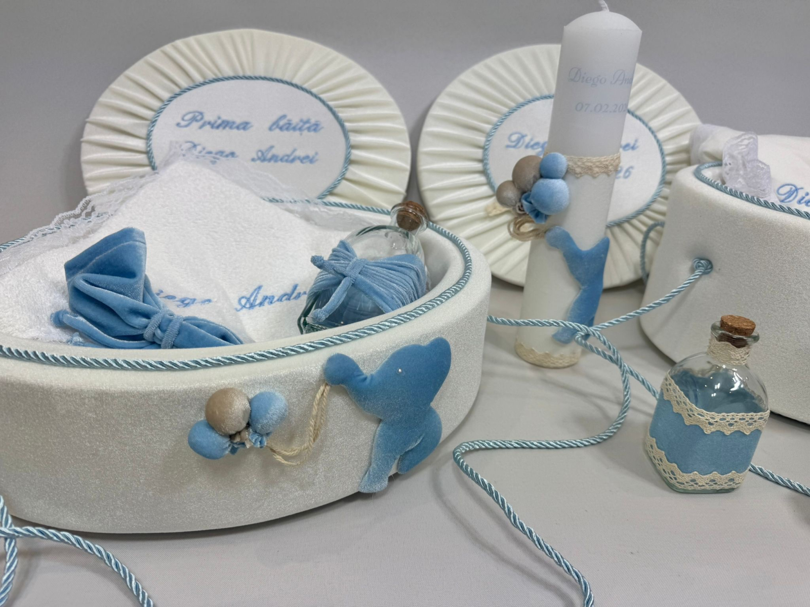 Set trusou botez la cufar din catifea si lumanare+ Set prima baita Luxury