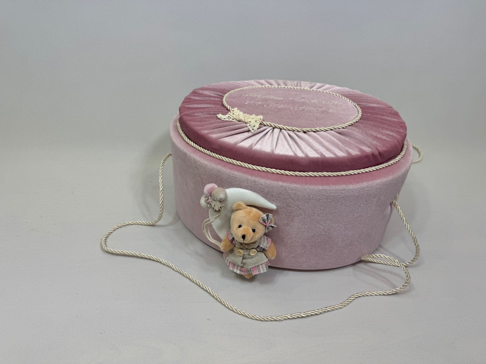 Trusou botez la cufar din catifea  accesorizate cu dantelute si  accesorii de calitate.Trusoul se regaseste in cufar din catifea  cu capac si manere din snur.