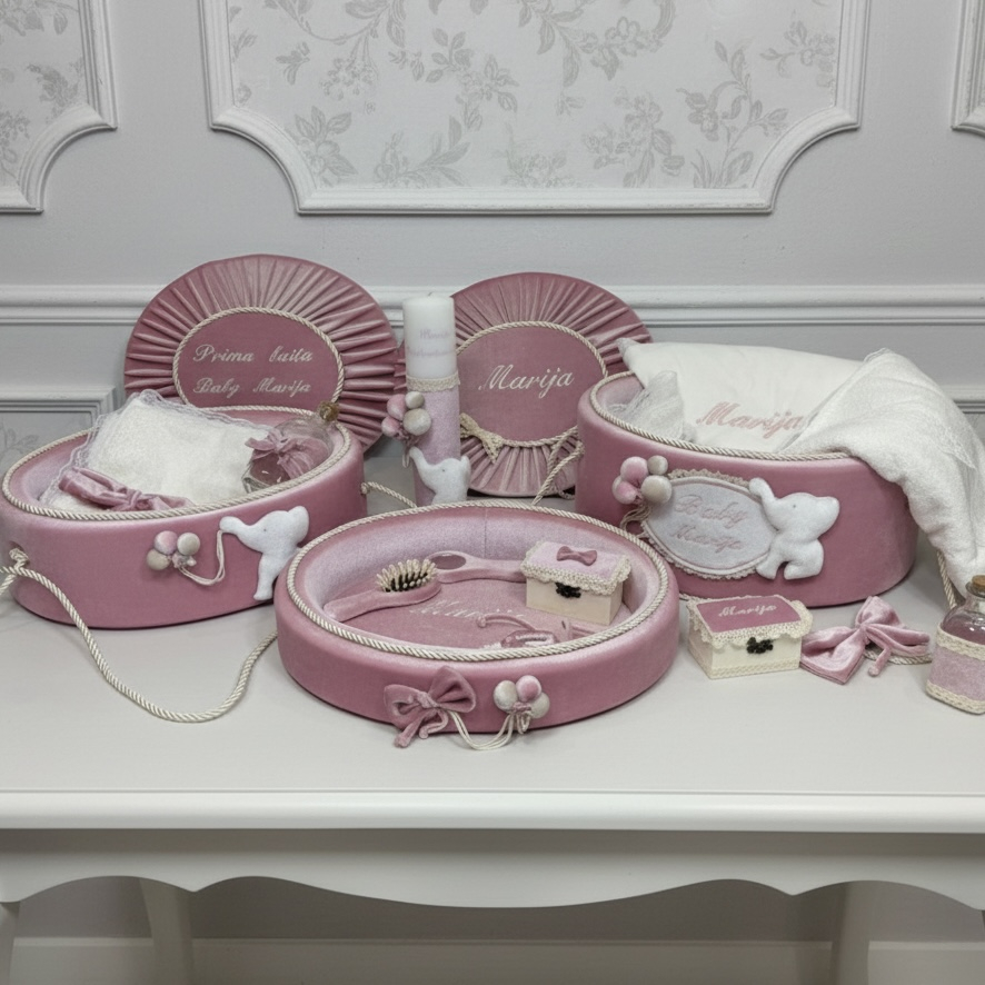 .Prosoapele si crasma sunt decorate cu dantela eleganta si sunt din bumbac 100% .Capacul cufarului exterior capacul cufarului de la Prima Baita si tavita de mot  sunt personalizate gratuit.Trusoul se poate personaliza contracost la cererea clientului pe fasa,crasma,prosop bebe,lumanare,capac cufar interior.Pentru alte detalii si lamuriri puteti contacta un consultant din echipa noastra
