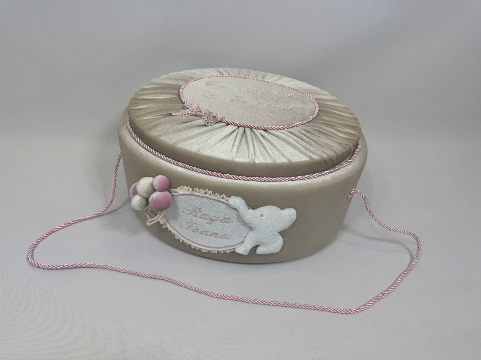 .Prosoapele si crasma sunt decorate cu dantela eleganta si sunt din bumbac 100% .Capacul cufarului exterior  este personalizat gratuit.Trusoul se poate personaliza contracost la cererea clientului pe fasa,crasma,prosop bebe,lumanare,capac cufarului.