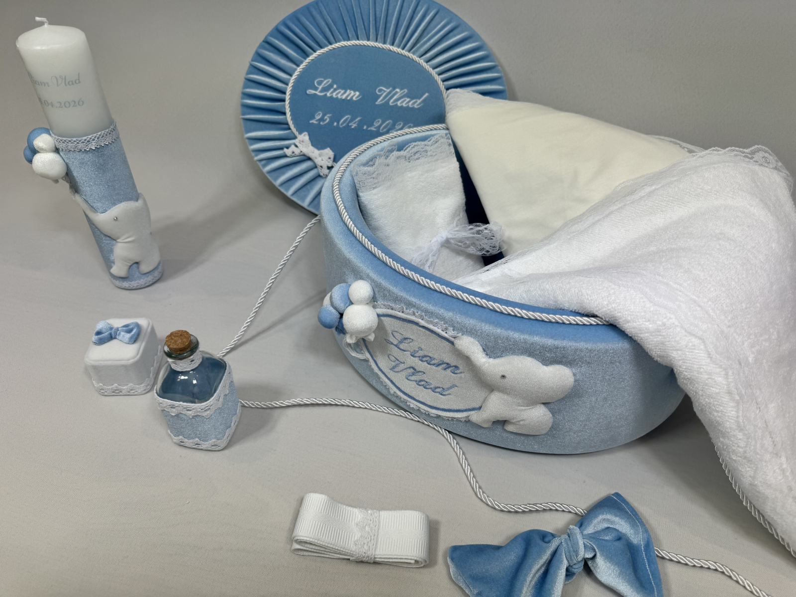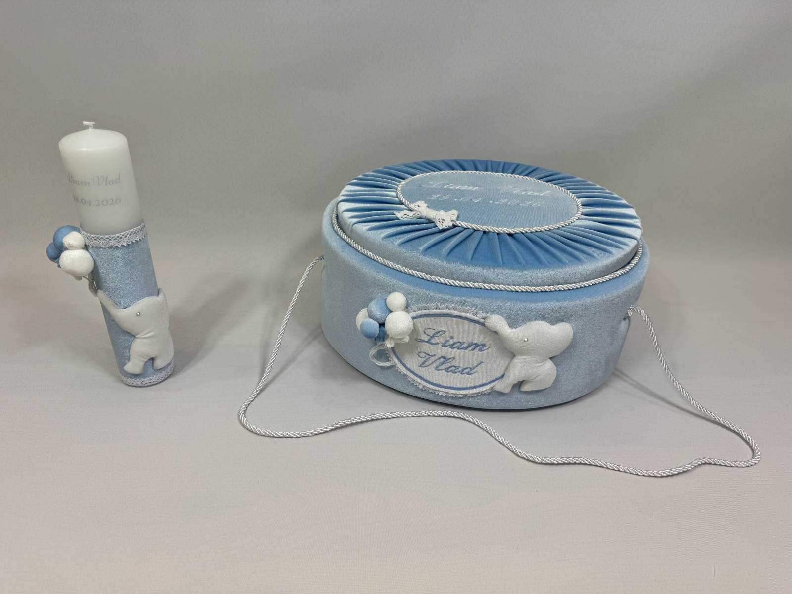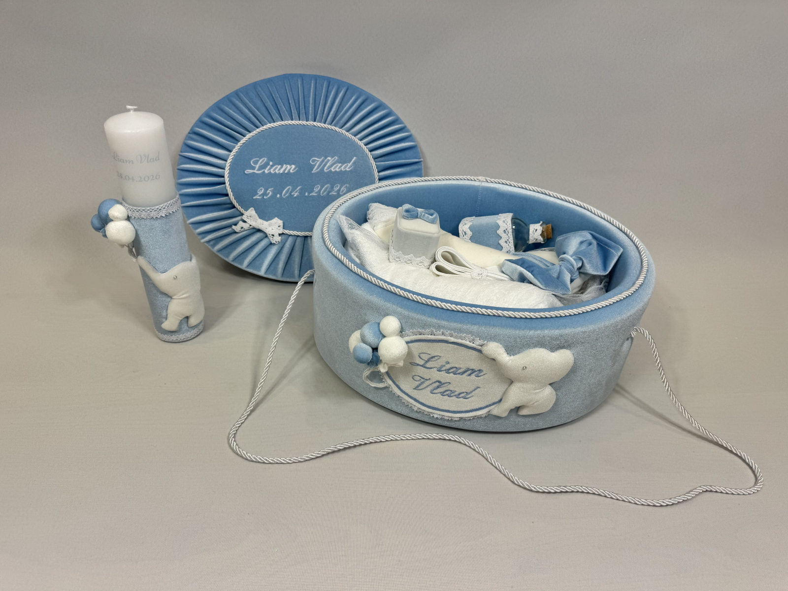 Acest trusou de botez este o creație plină de delicatețe , realizat manual din catifea fină într-o nuanță superbă de blue baby.Piesa de rezistență este cufărul oval, al cărui capac plisat îi conferă un aer regal.Tematica setului este una de poveste, având ca element central un elefănțel simpatic cu baloane, aplicat în relief atât pe cufar , cât și pe lumânarea de botez asortată. Ansamblul este completat armonios de accesorii esențiale.