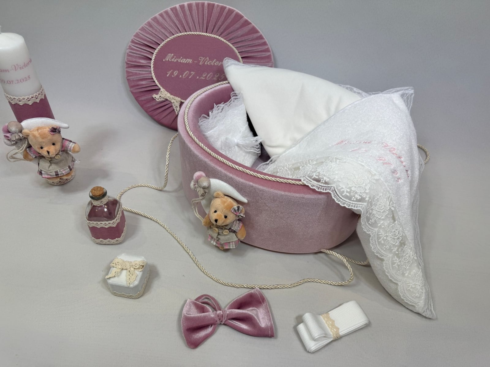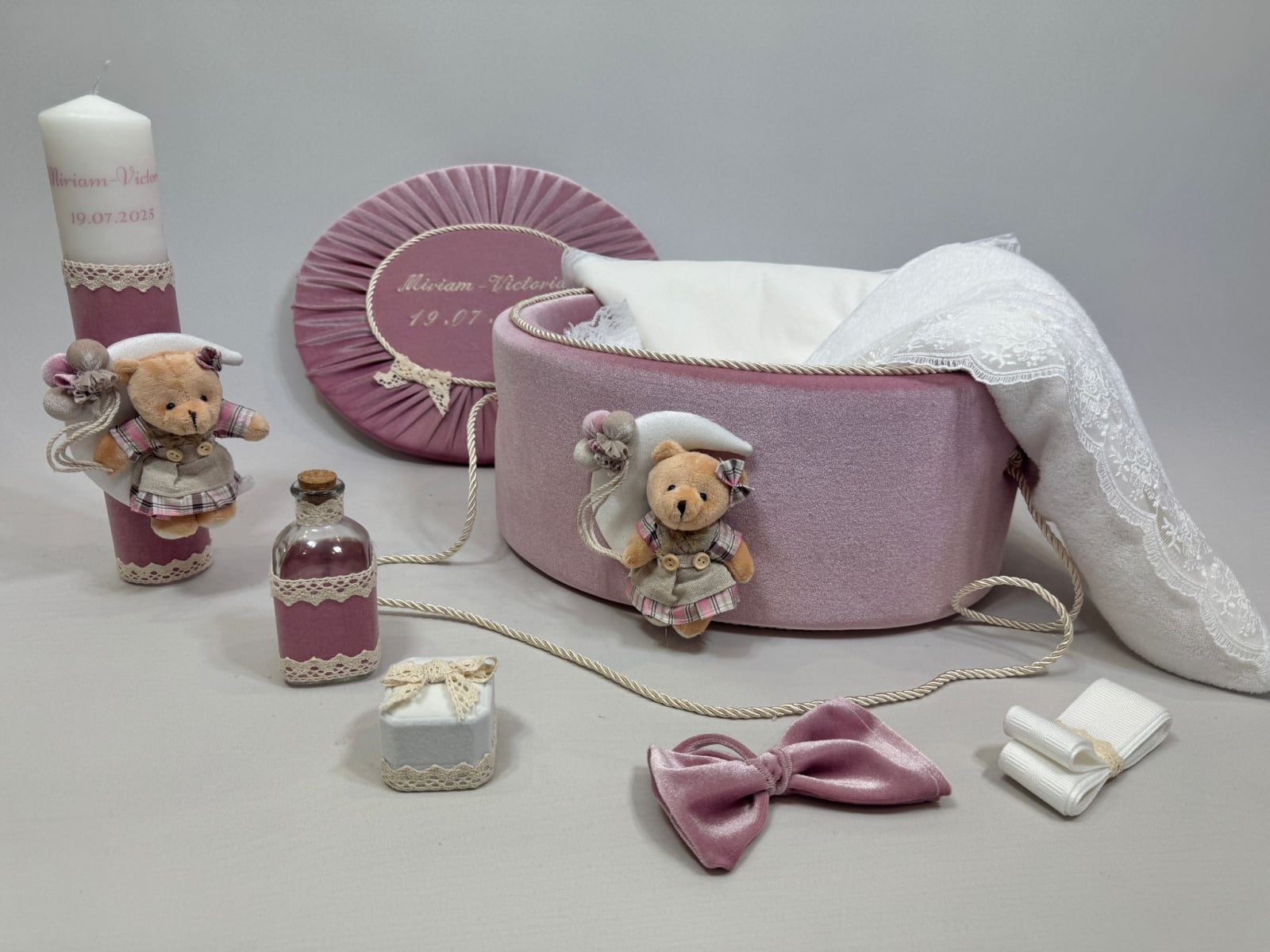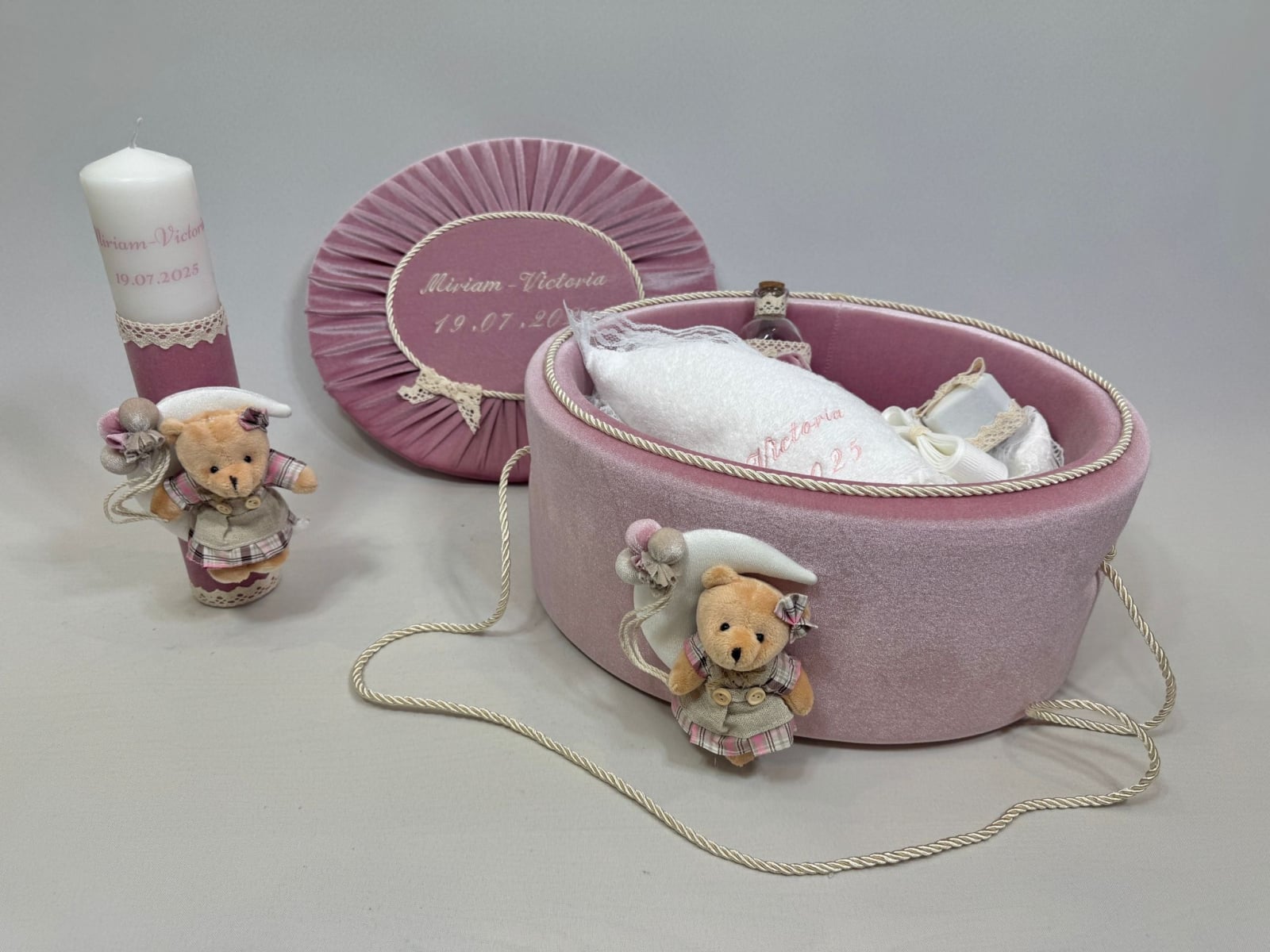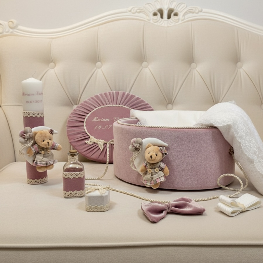 Trusou botez la cufar din catifea si lumanare accesorizate cu dantelute si accesorii de calitate.Trusoul se regaseste in cufar din catifea cu capac si manere din snur.Lumanarea este cilindrica si are dimensiunile 30/5.8 cm.