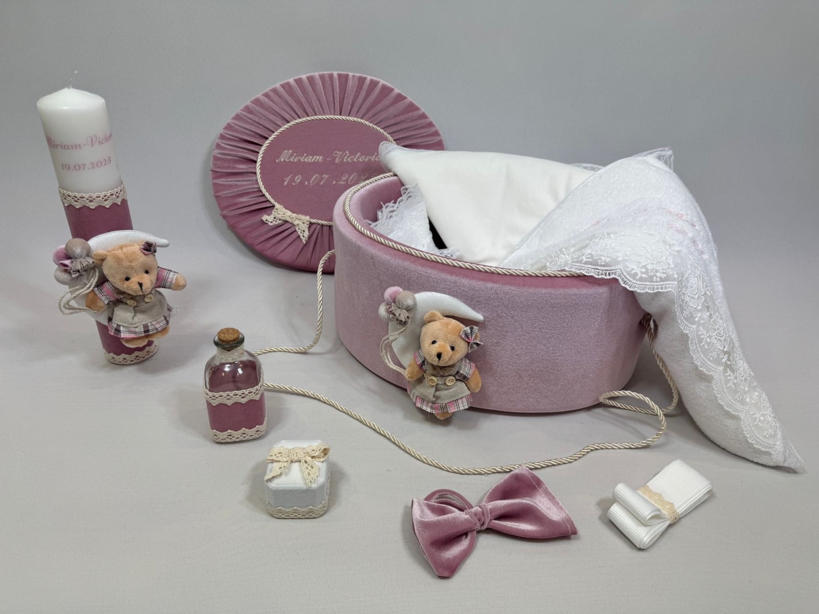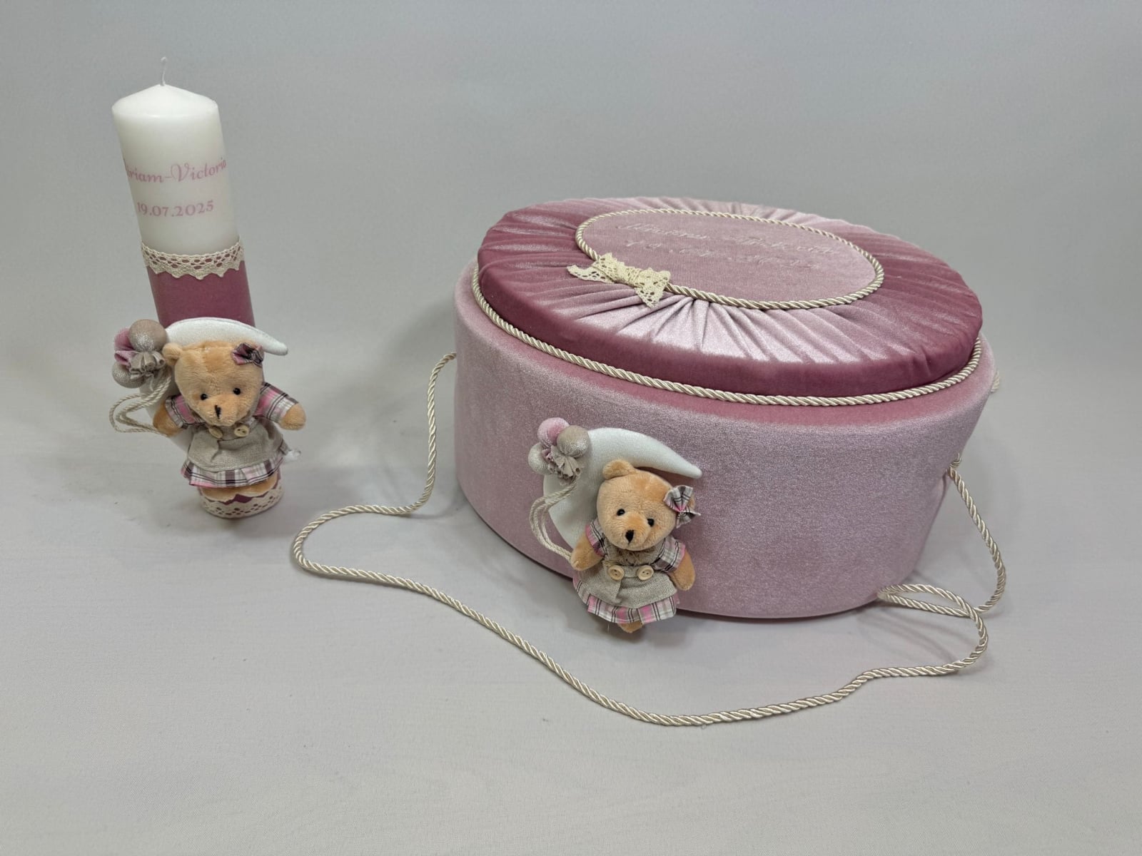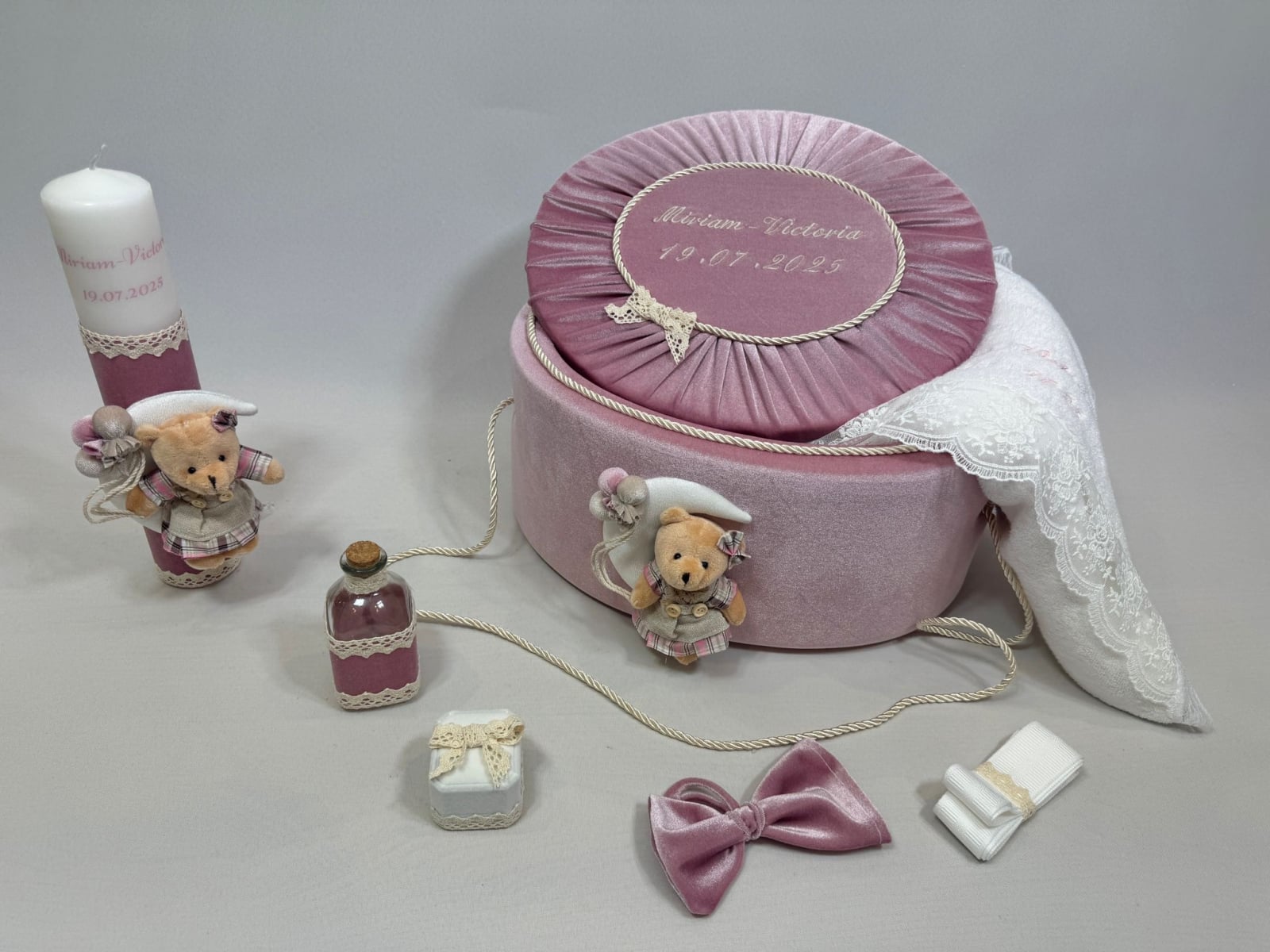 Trusou botez la cufar din catifea si lumanare accesorizate cu dantelute si accesorii de calitate.Trusoul se regaseste in cufar din catifea cu capac si manere din snur.Lumanarea este cilindrica si are dimensiunile 30/5.8 cm.
