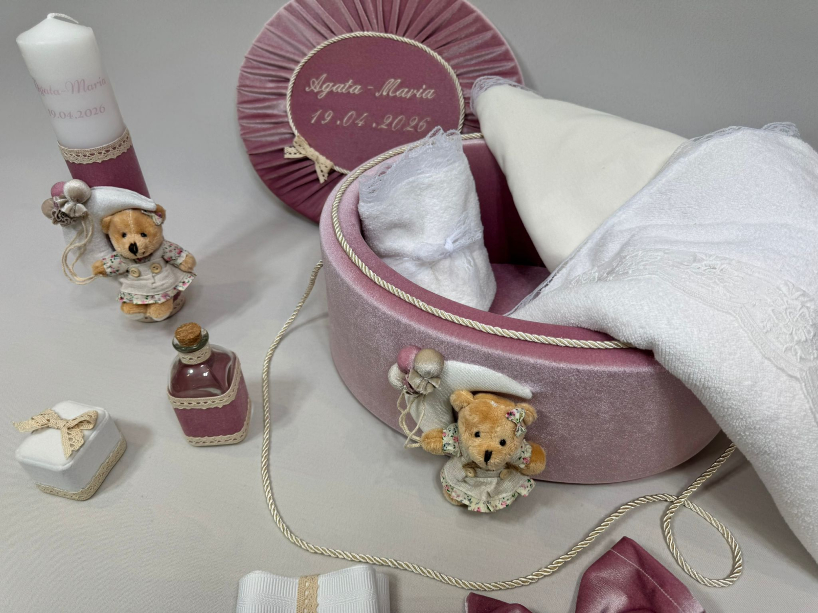 Acest trusou de botez complet, lucrat manual cu o atenție deosebită la detalii, este definiția eleganței și a gingășiei. Setul este dominat de nuanțe calde de roz prafuit , fiind găzduit într-un cufăr oval îmbrăcat în catifea fină.