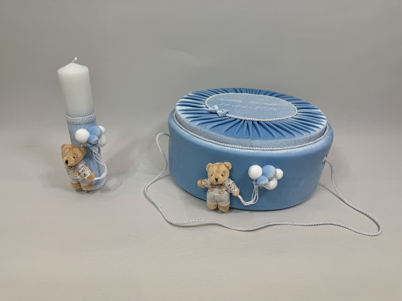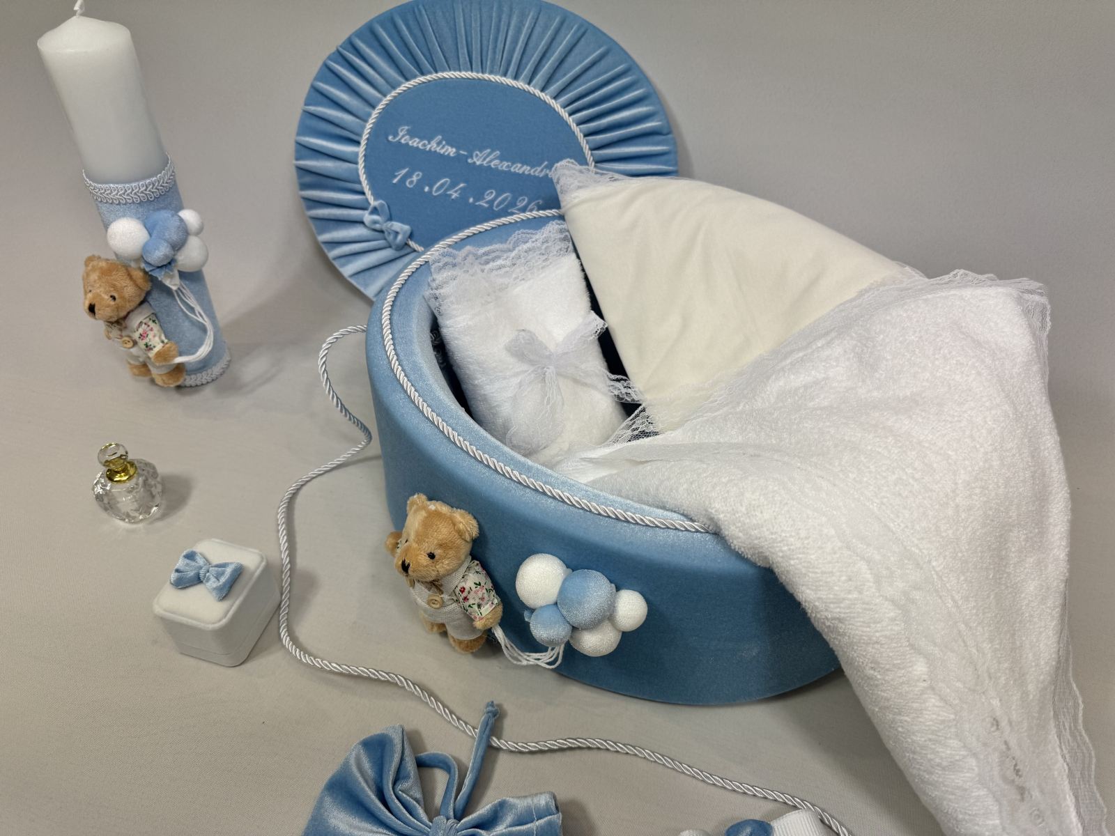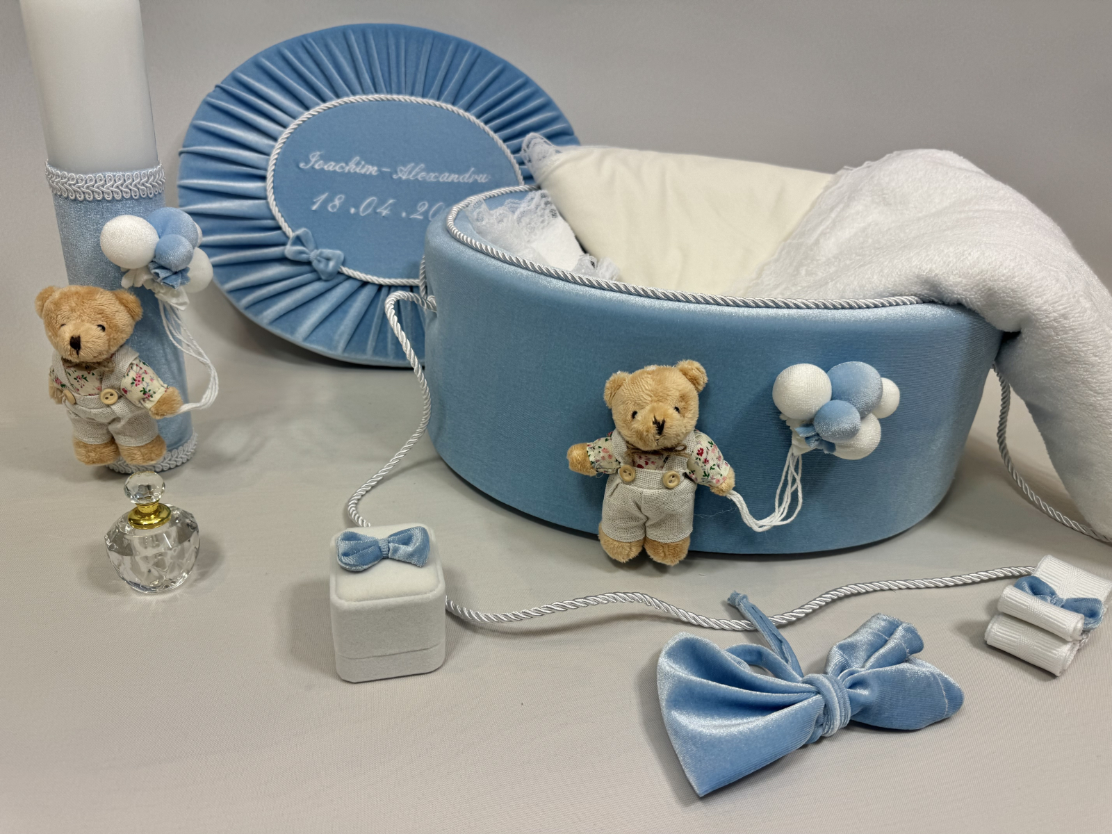Acest set de botez este realizat manual, incluzând o lumânare decorată și un cufăr elegant din catifea. Setul este accesorizat cu ursuleți de pluș adorabili, baloane decorative și alte elemente delicate, creând o prezentare rafinată pentru ceremonia de botez.