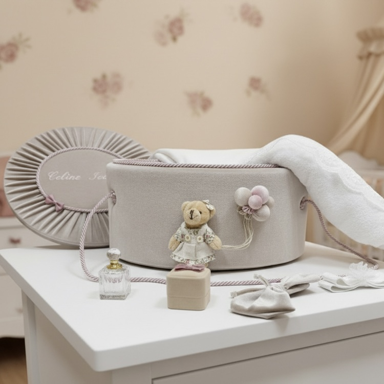 Acest trusou de botez, lucrat integral manual, este prezentat într-un cufăr elegant din catifea. Setul include articole delicate, cum ar fi un ursuleț de pluș cu balonase toate asortate într-o paletă de culori pastelate, perfecte pentru a celebra un eveniment special.