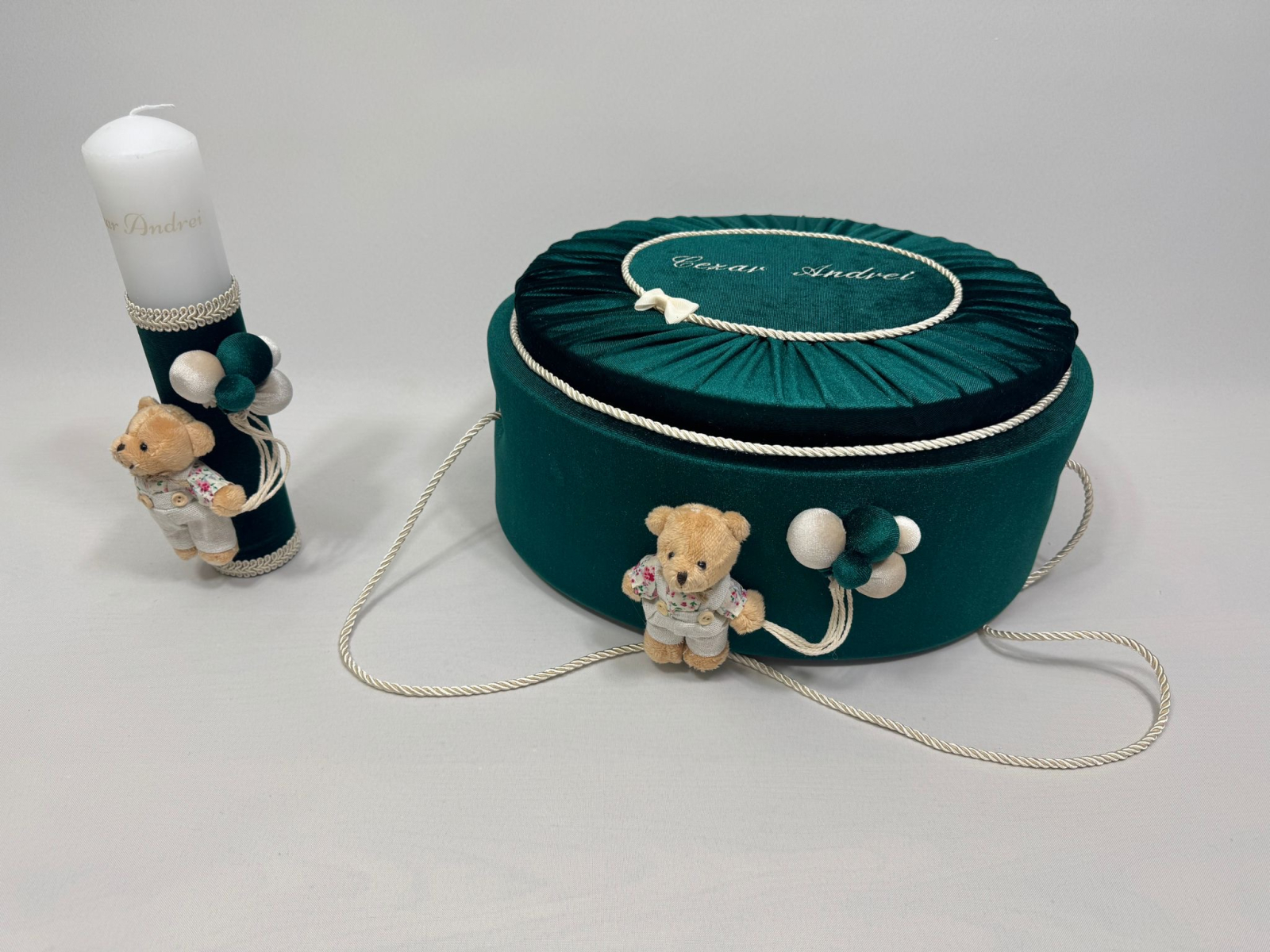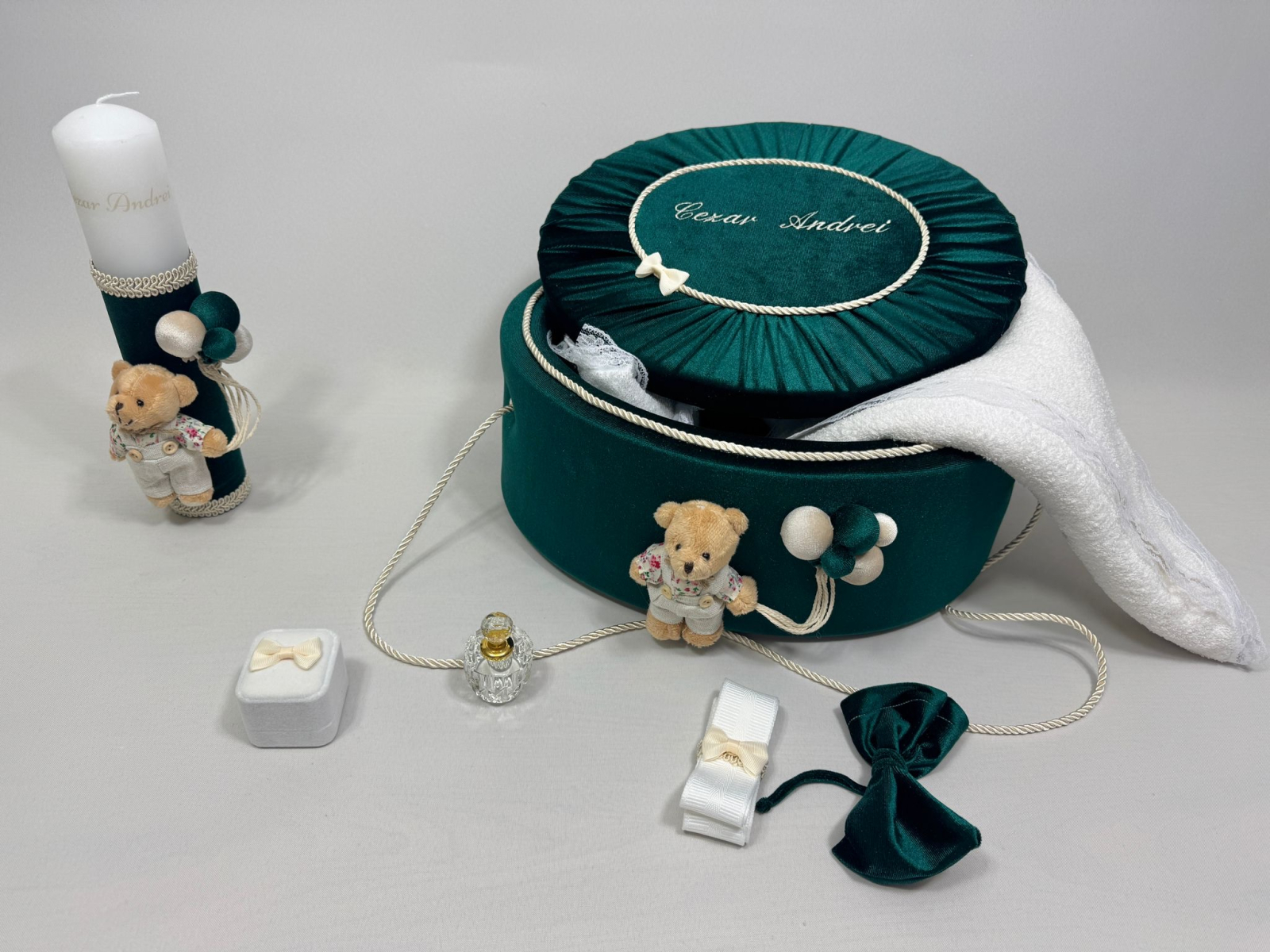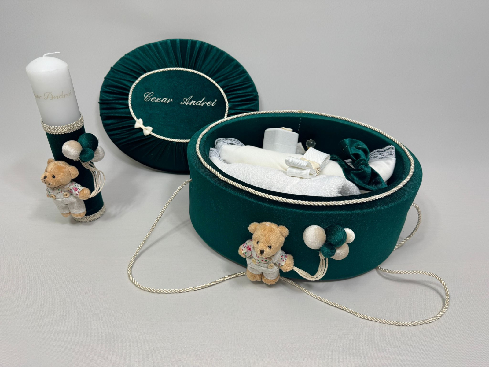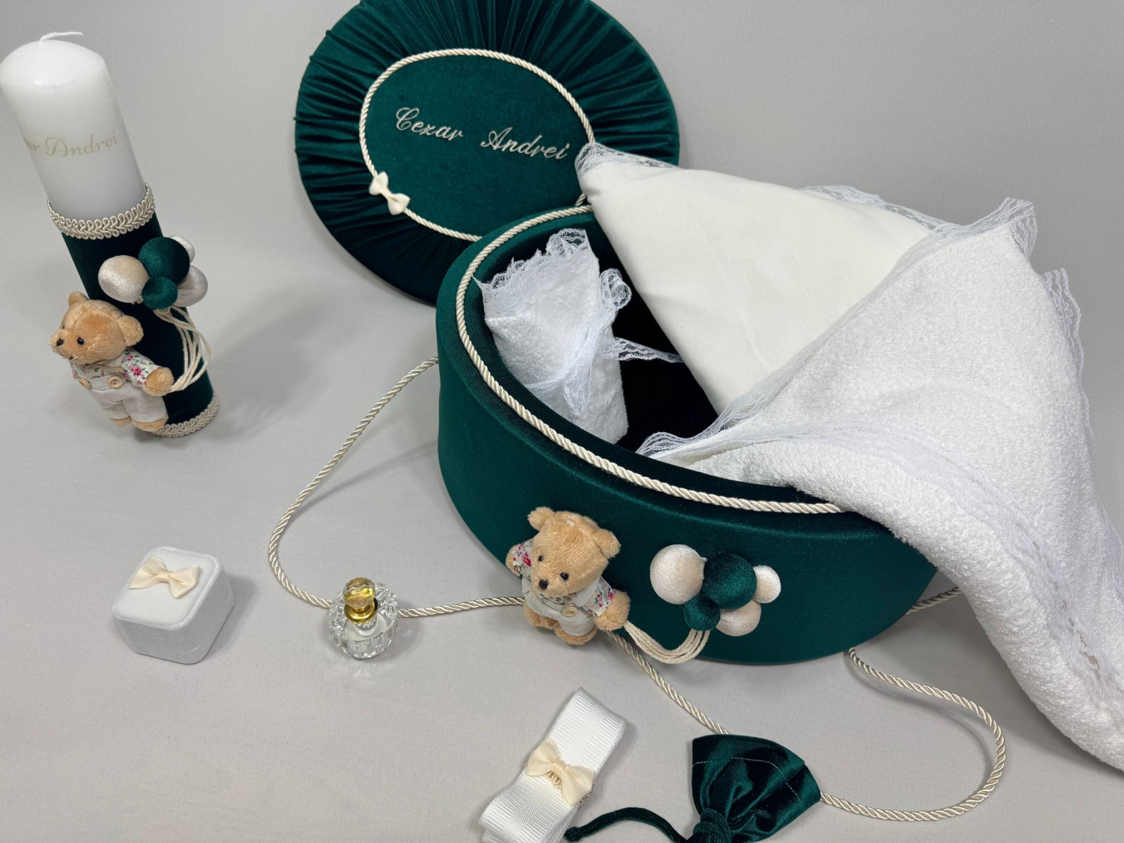 Trusou botez la cufar din catifea si lumanare accesorizate cu dantelute si  accesorii de calitate.Trusoul se regaseste in cufar din catifea  cu capac si manere din snur.Lumanarea este cilindrica si are dimensiunile 30/5.8 cm.